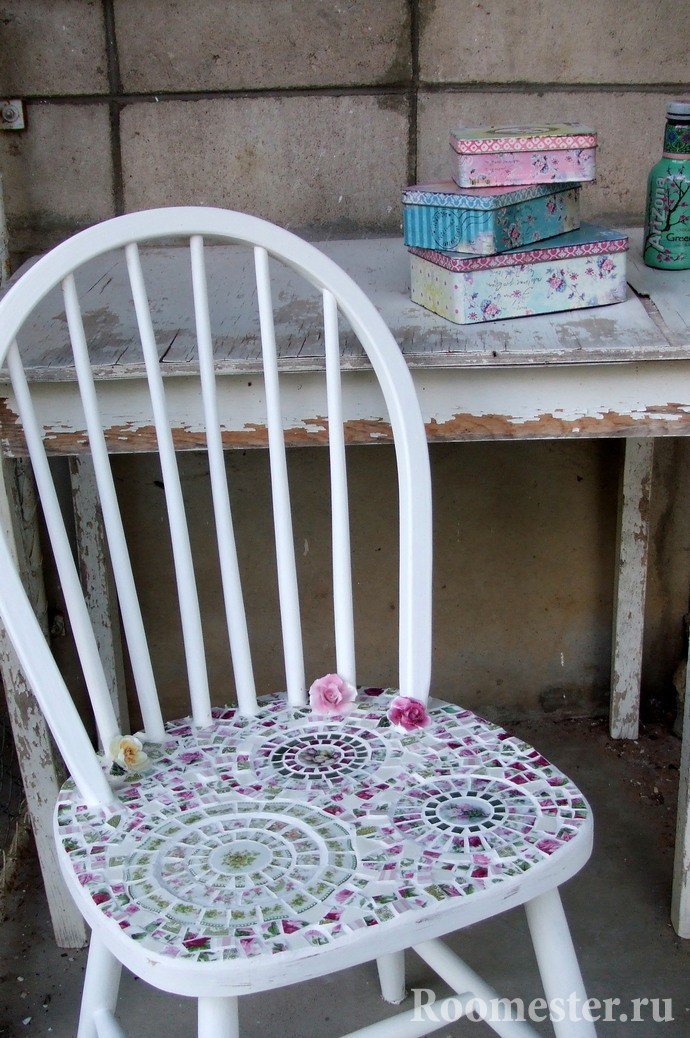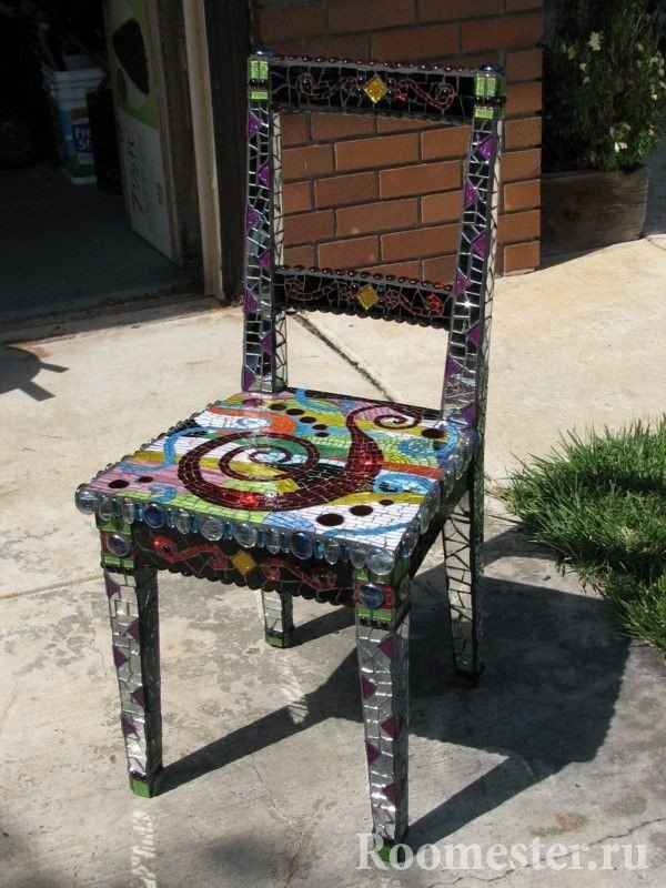 Si además de las viejas sillas de la casa todavía hay discos innecesarios o dañados, puede decorar el elemento de los muebles con un mosaico. El patrón hecho de pequeñas piezas de colores se verá original e interesante, y la silla actualizada encajará perfectamente en casi cualquier interior.