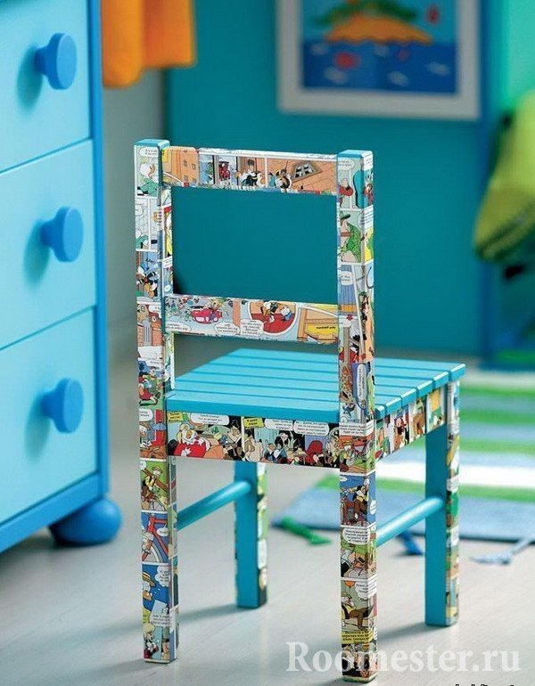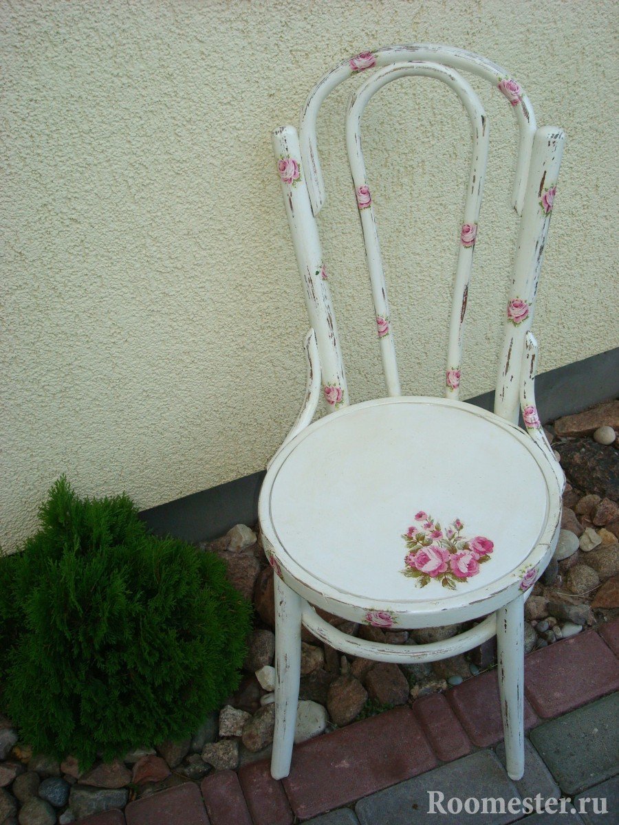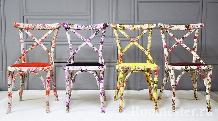 La silla se actualiza en varias etapas. Los muebles se limpian con revestimientos viejos, barniz o pintura, se desengrasan y se impriman. A continuación, el fondo principal se aplica con pintura acrílica. Después del secado, se pega un patrón a la superficie, se trata con pinturas, elementos adicionales y se barniza.
