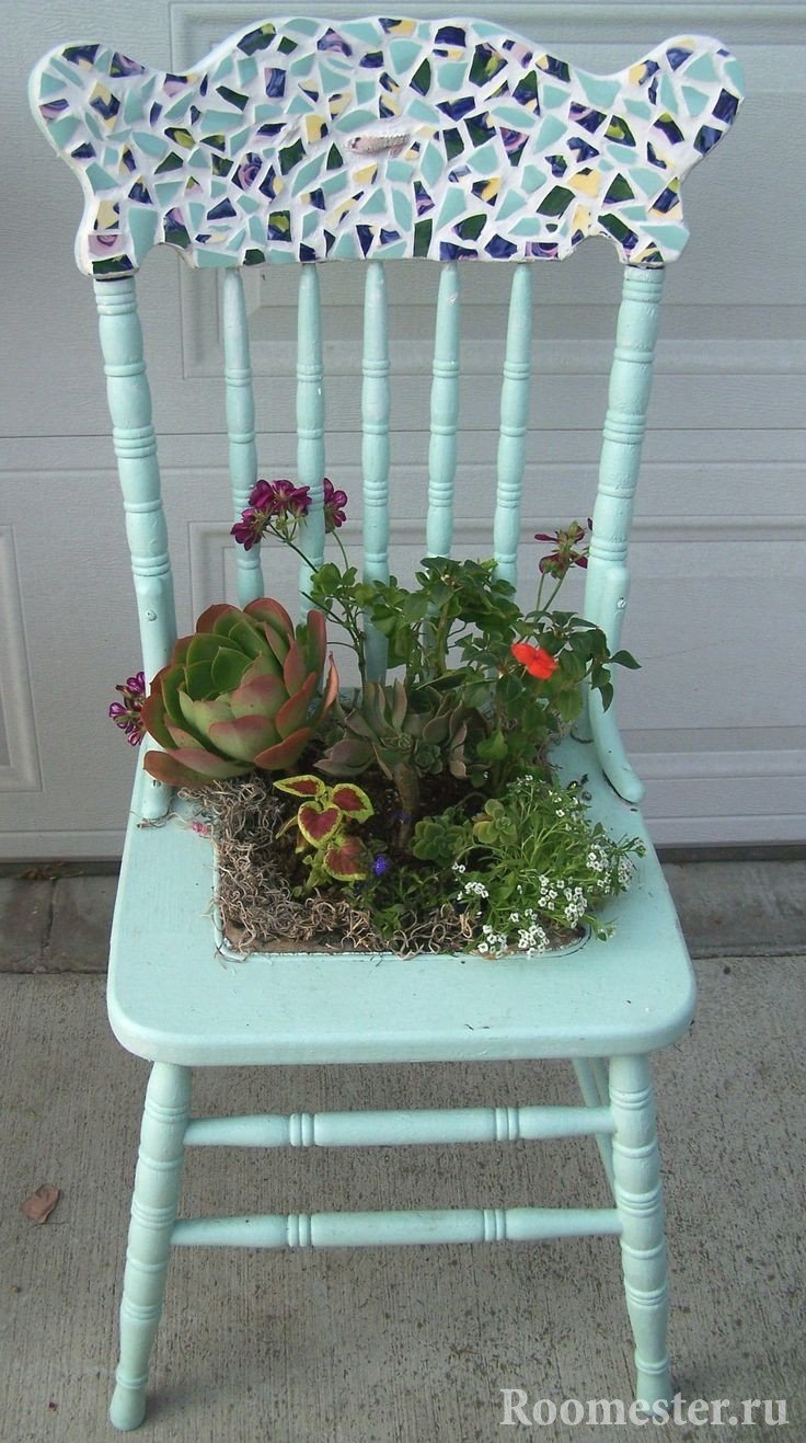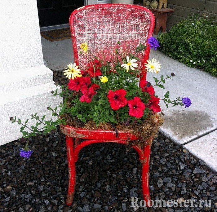 Una silla vieja no tiene que quedarse en casa; puede encontrar su nuevo lugar en el jardín o en la terraza en forma de un macizo de flores original. Al mismo tiempo, no es necesario restaurarlo, restaurarlo, repararlo.