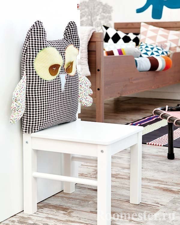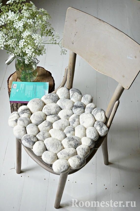 La decoración de la silla con pompones es muy costosa en términos de material y tiempo, pero como resultado, la silla restaurada se ve muy luminosa y cómoda. Complementa perfectamente la guardería, y tal vez se convierte en un acento colorido de la habitación o sala de estar. Es más conveniente sujetar los pompones en una cuadrícula o un pedazo de tela.Al final del trabajo, el forro suave se fija en el asiento y el respaldo de la silla. Si es necesario, la decoración se puede quitar y lavar fácilmente. Los asientos de pompón muy interesantes se verán en los taburetes de la cocina.