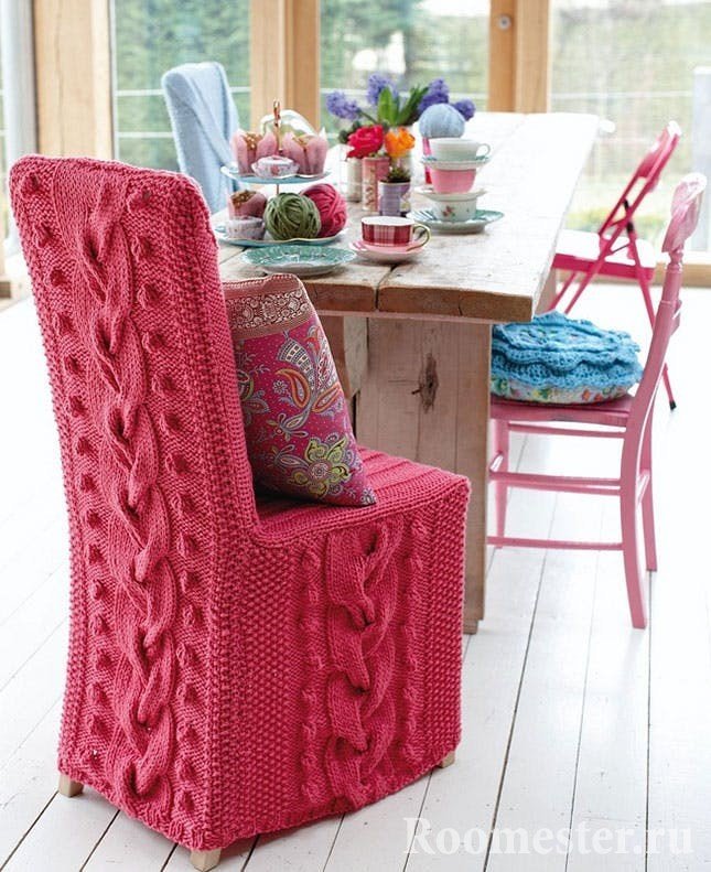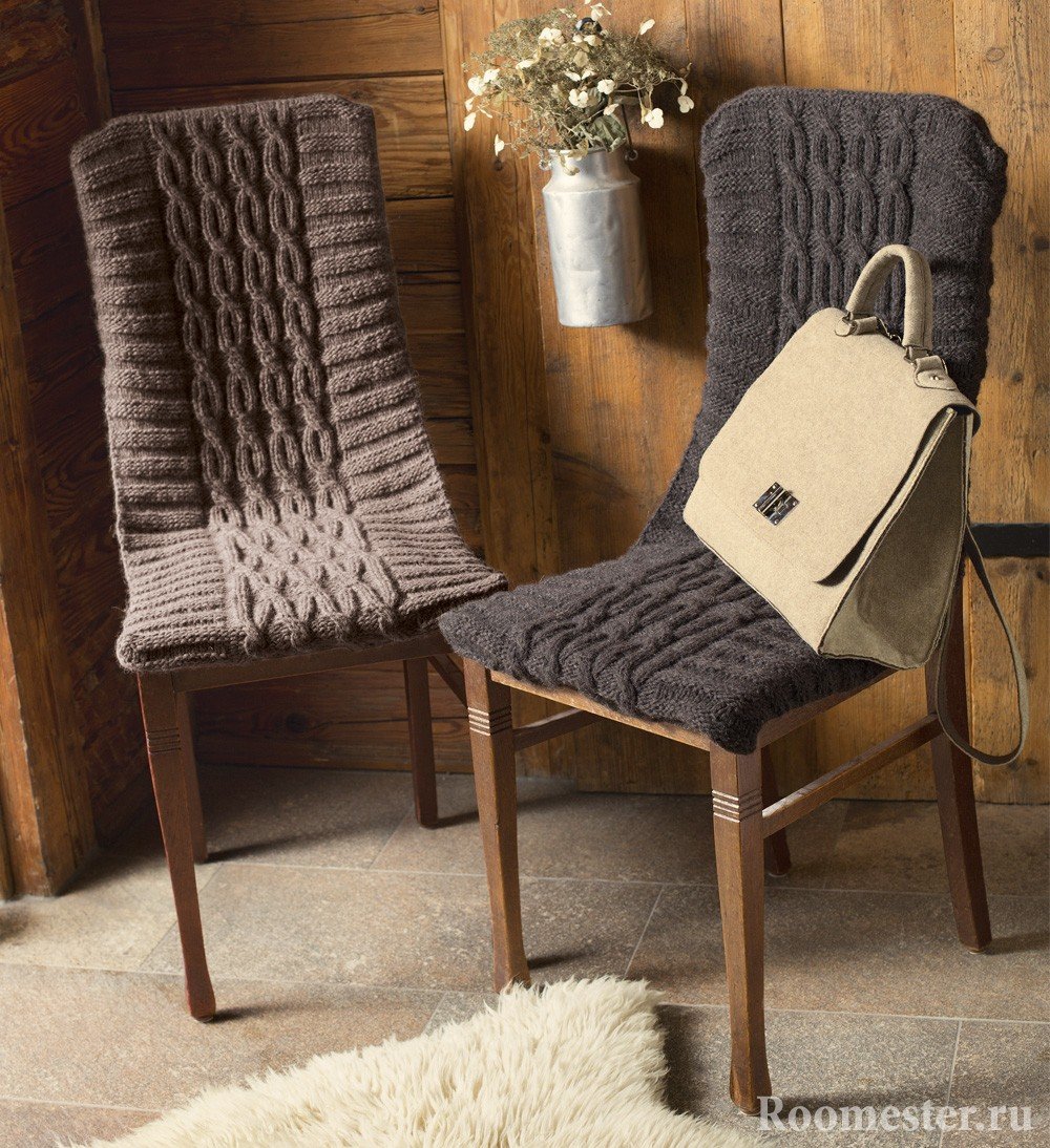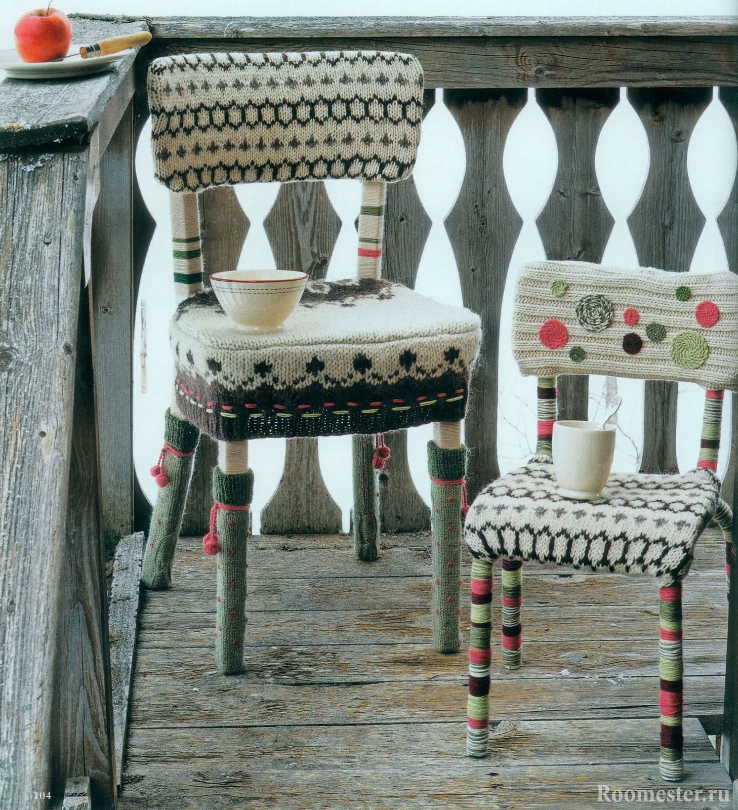 Las fundas de punto serán especialmente apropiadas en el invierno, se asociarán con calidez y comodidad. Las prendas de punto se ven muy interesantes, como si un suéter enorme fuera tirado en una silla congelada. Un patrón volumétrico grande de un hilo grueso de color pastel será óptimo. Por supuesto, si el alma lo requiere, puedes elegir tonos más brillantes.