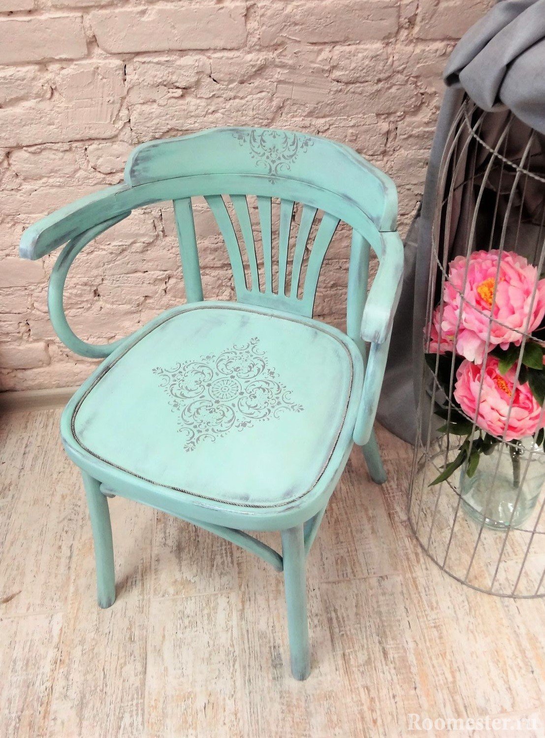 La pintura en aerosol permite crear cualquier patrón a través de una plantilla. Como opción, puede poner una servilleta de encaje en el asiento, el respaldo y los brazos de la silla y aplicar pintura a través de ella. El resultado es un patrón rústico suave.