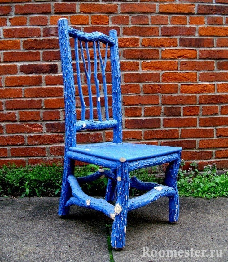 Las sillas de madera deben ser lo más naturales posible, por lo que se limpian de barniz, se frotan con papel de lija fino y se dejan de esta forma. Lo máximo que se puede hacer es cubrir con una mancha para dar sombra. La corteza preparada del árbol está pegada en orden libre, los diseñadores eligieron una pata y la espalda para pegar.
