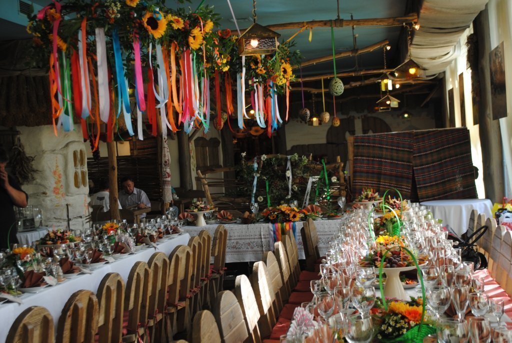 Las mesas de invitados están decoradas en el mismo estilo que el lugar para los jóvenes, pero un poco más modesto. Además, se colocan tarjetas de invitado en las mesas para que todos los familiares y amigos encuentren fácilmente su lugar en la celebración. Dependiendo del tema de la celebración, las tarjetas de invitado también se emiten de manera diferente. Por ejemplo, en una boda en un estilo medieval, estas tarjetas se pueden hacer en papel envejecido, que está escondido en una bolsa.
