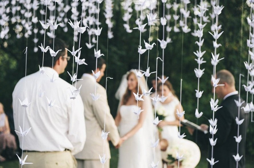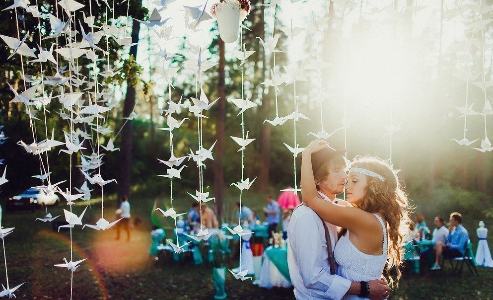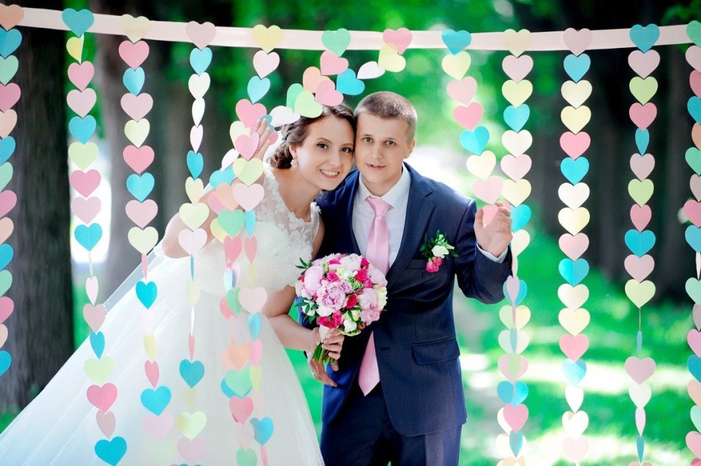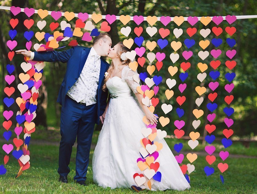 Las guirnaldas serán una decoración ideal para una zona de fotos de bodas o se pueden usar para decorar un salón de bodas. Las guirnaldas de papel se pueden crear de forma independiente, para lo cual se utilizan papel multicolor, pegamento, hilos y tijeras. Antes de comenzar a trabajar, debe elegir los colores en los que se realizará la guirnalda. Luego, de un cartón grueso, debe cortar una pieza de trabajo, que servirá como base para cortar piezas de papel. Luego, usando la base, se cortan los espacios en blanco de papel. Si se hacen elementos de papel de varios colores, es aconsejable colocarlos inmediatamente en varias cajas para no confundirse.Las figuras se pueden hacer voluminosas pegando varias partes juntas o dejándolas solas.