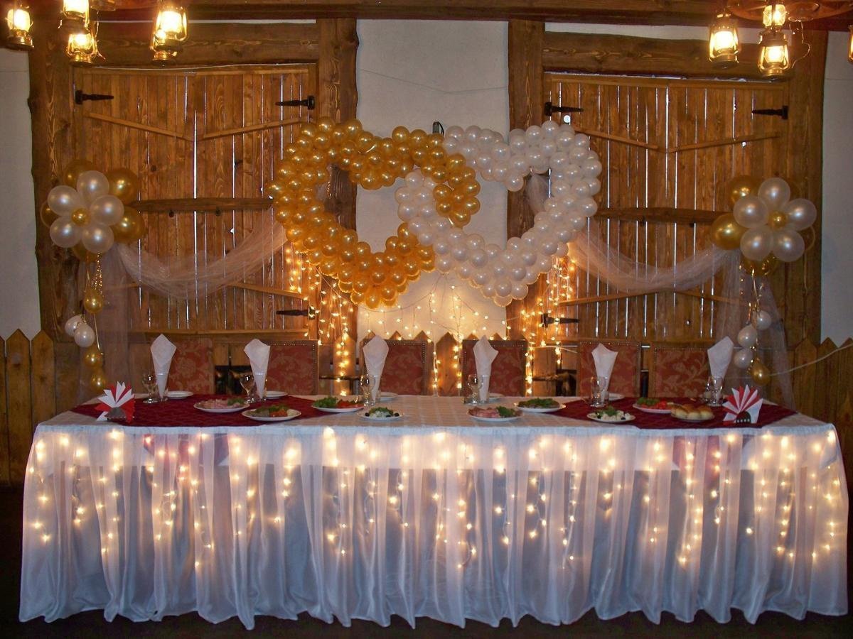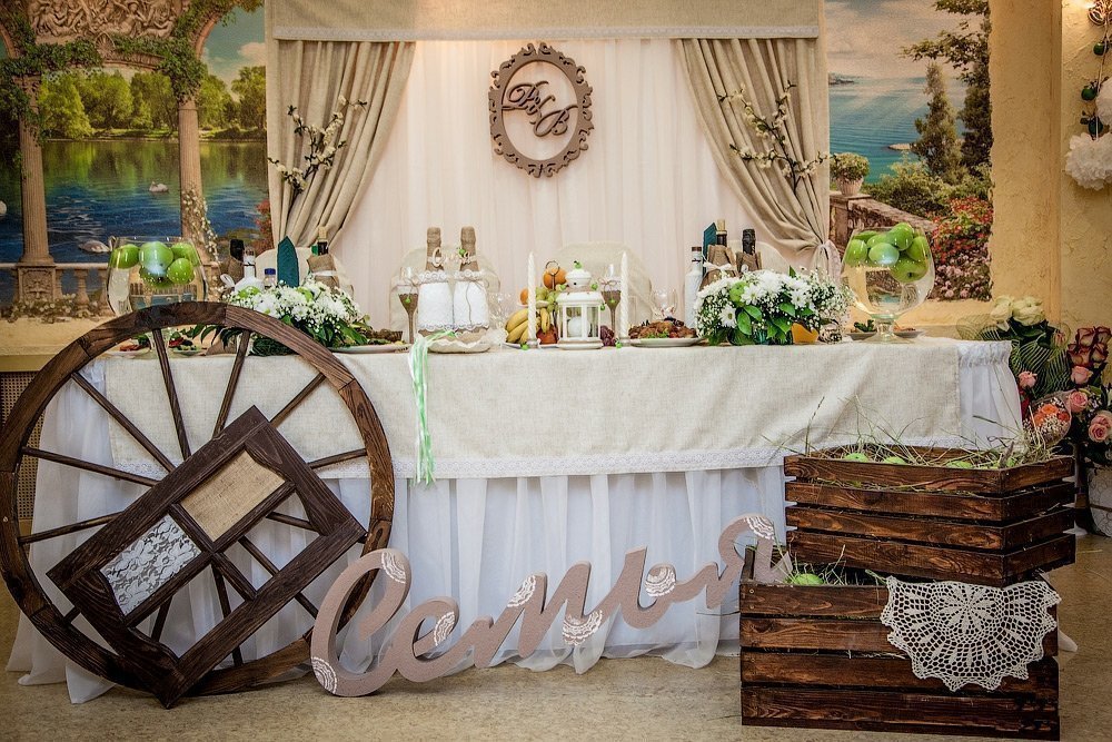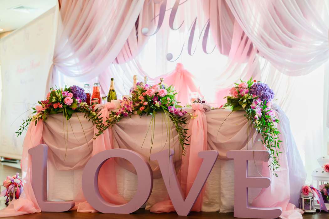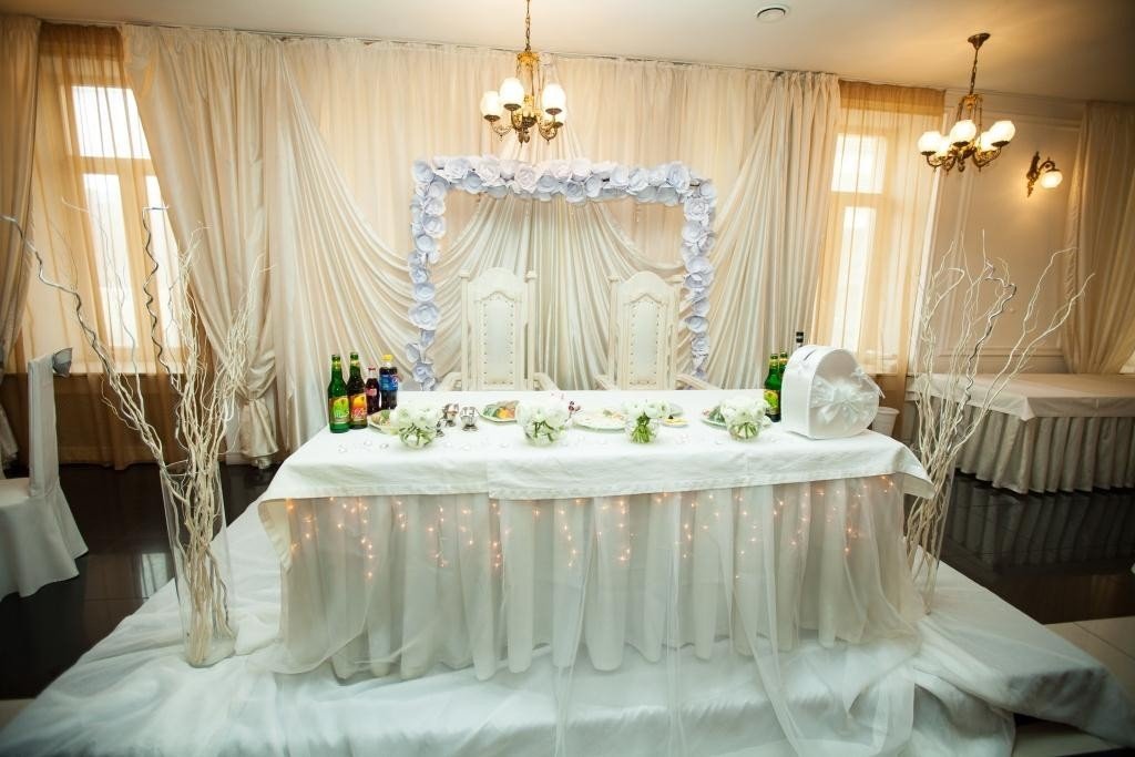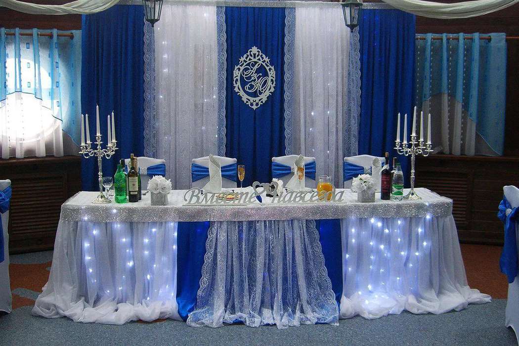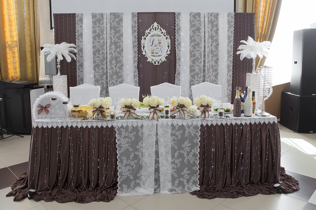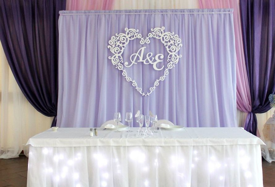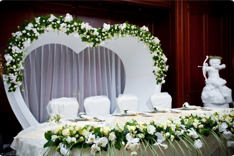 Esta es la mesa más importante en las vacaciones. Por lo general, una mesa para jóvenes se destaca incluso visualmente, ya que se encuentra en el centro del pasillo. Para enfatizar la peculiaridad de este lugar, es costumbre decorarlo más que otros. Entonces, la superficie de la mesa está cubierta con un mantel de color, que está decorado con tela, figuras de papel o guirnaldas eléctricas. Grandes arreglos florales se colocan encima del mantel. Suelen poner sobre la mesa jóvenes emparejado botellas de champánasí como vasos decorados para recién casados. La mesa también se puede decorar con velas, figuras o letras de yeso.