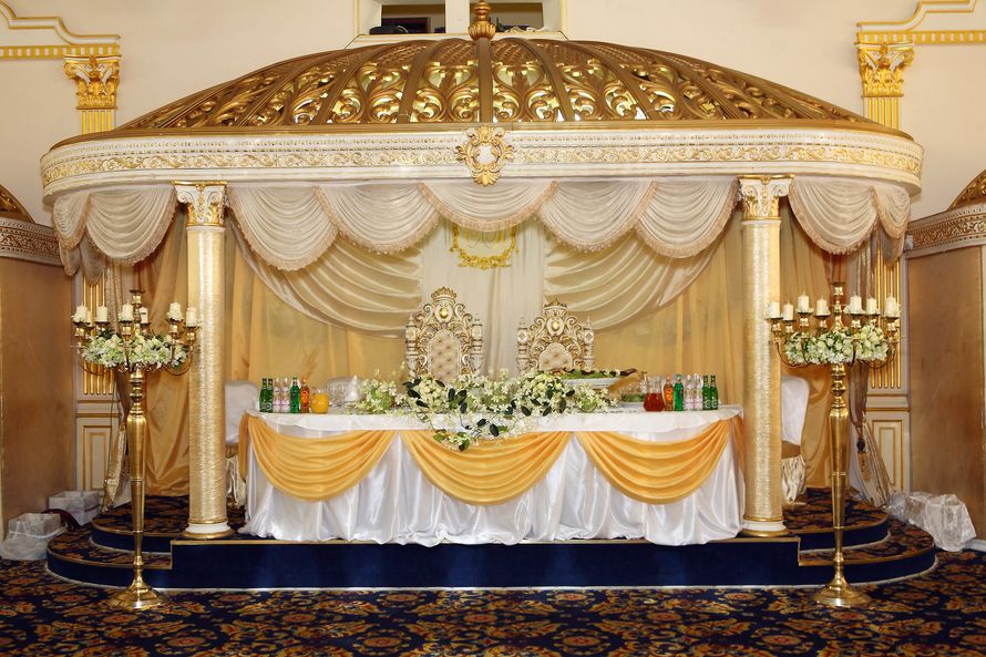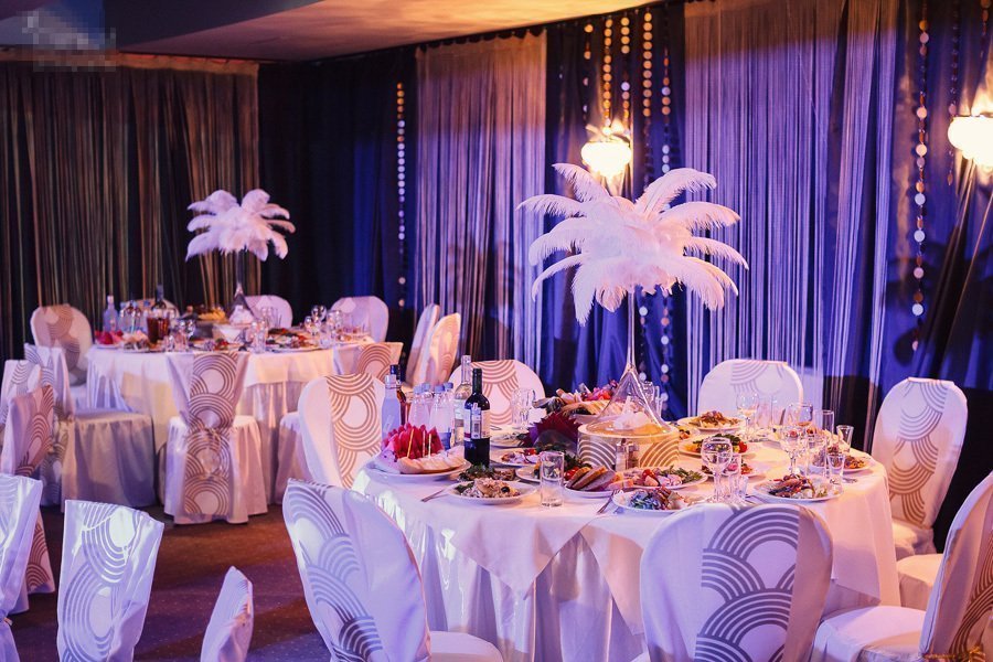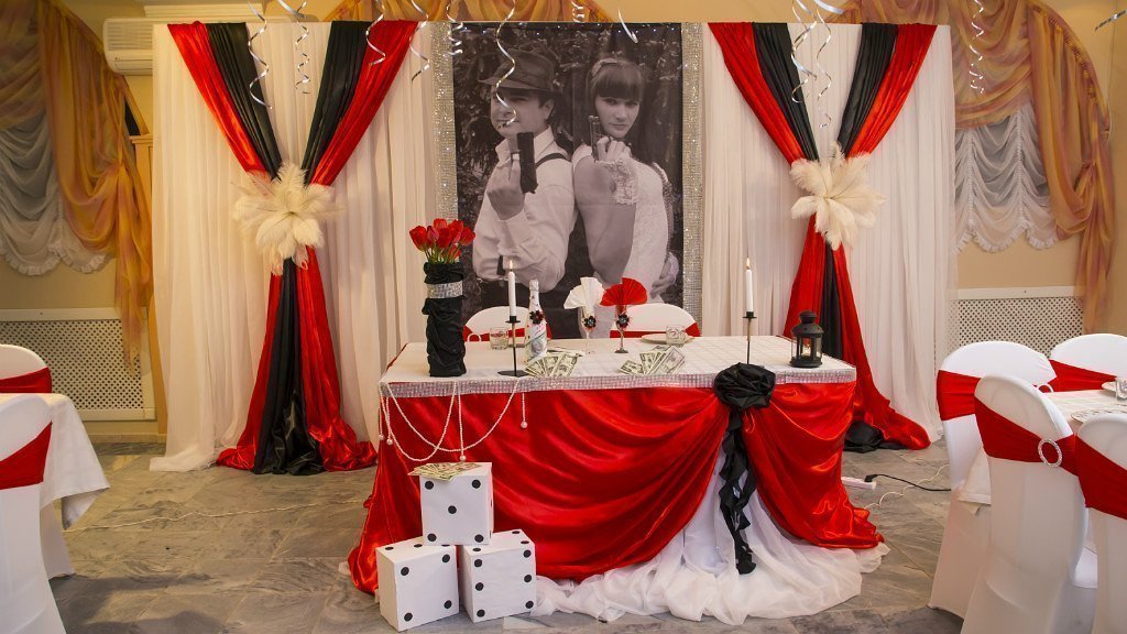 Para una ceremonia de este estilo, debe encontrar un restaurante con un salón lujoso, en el que haya una gran cantidad de elementos cubiertos con oro y diamantes de imitación. Si no hay oportunidad de reservar ese lugar, puedes trabajar duro y decorar una habitación normal. Para esto, se utiliza una gran cantidad de tela en el diseño, que es caprichosamente burlón.