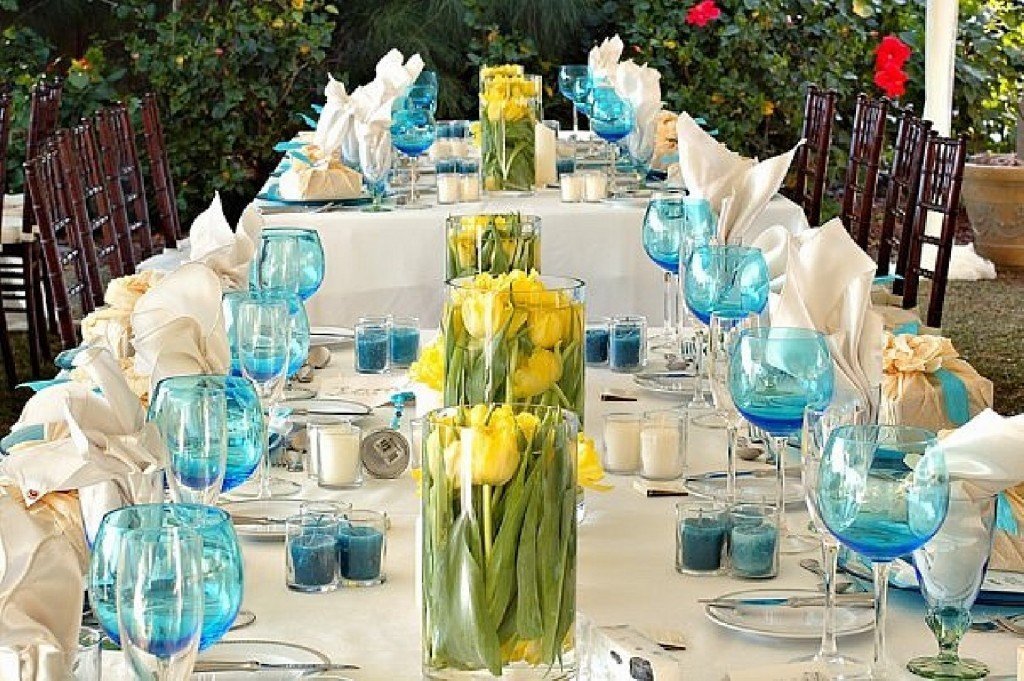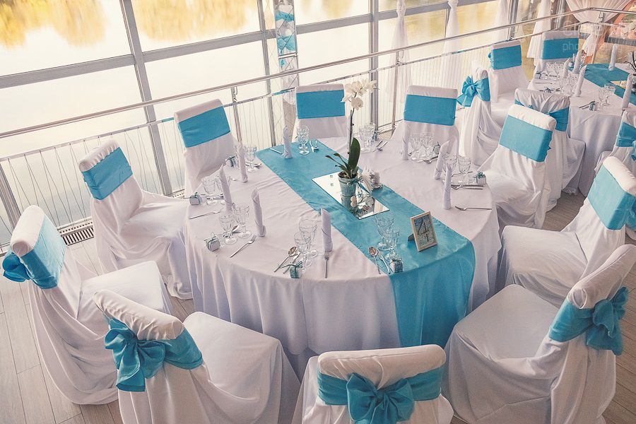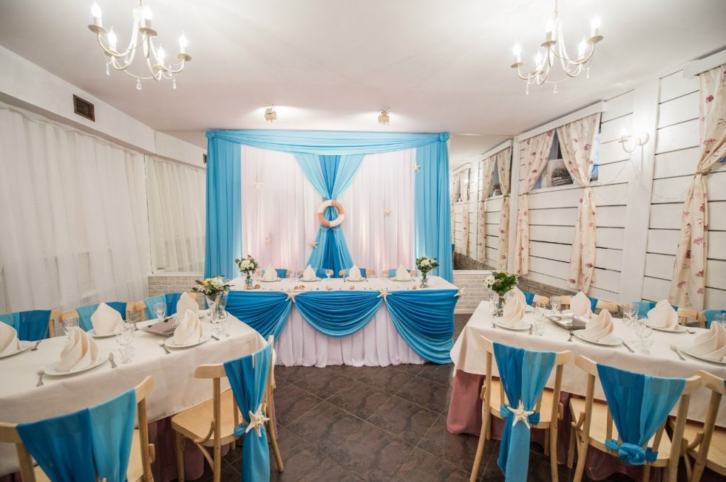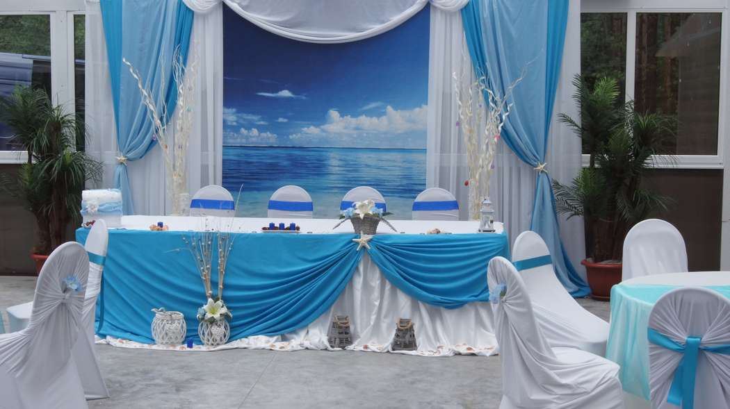 Para el diseño de la sala se utilizan todos los atributos de los sujetos marinos. Los principales son anclas, conchas, estrellas de mar, corales, cordeles.Colores de boda: blanco, todos los tonos de azul, esmeralda, colores pastel. El uso de la tira se ve original en el diseño de la sala. Usando textiles en el diseño, se da preferencia a las telas translúcidas claras. Colocando flores en el pasillo, se complementan con ramas de coral, conchas, siluetas de caballitos de mar.