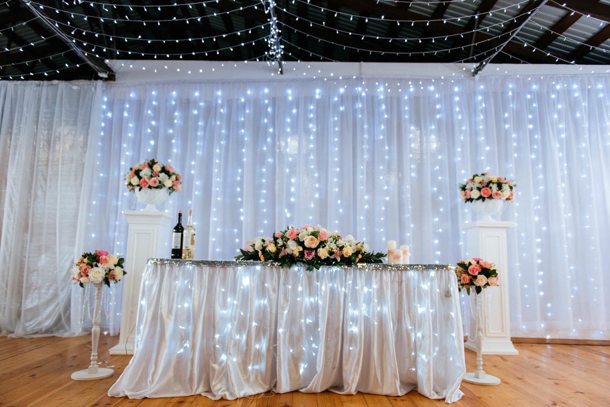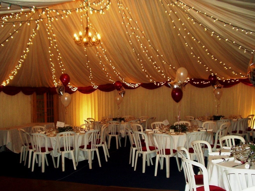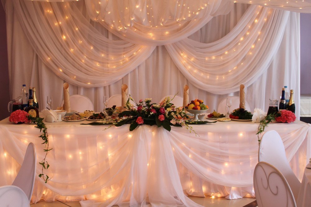 Para decorar el salón, puede usar guirnaldas eléctricas y flores o figuras de papel. Las guirnaldas eléctricas pueden colgarse del techo u ocultarse debajo de un mantel. En la tenue luz, un mantel iluminado creará una atmósfera romántica especial. Las guirnaldas de flores y papel se pueden hacer de forma independiente de medios improvisados. Dichos productos se utilizan para decorar la zona de fotos o el arco de la boda.