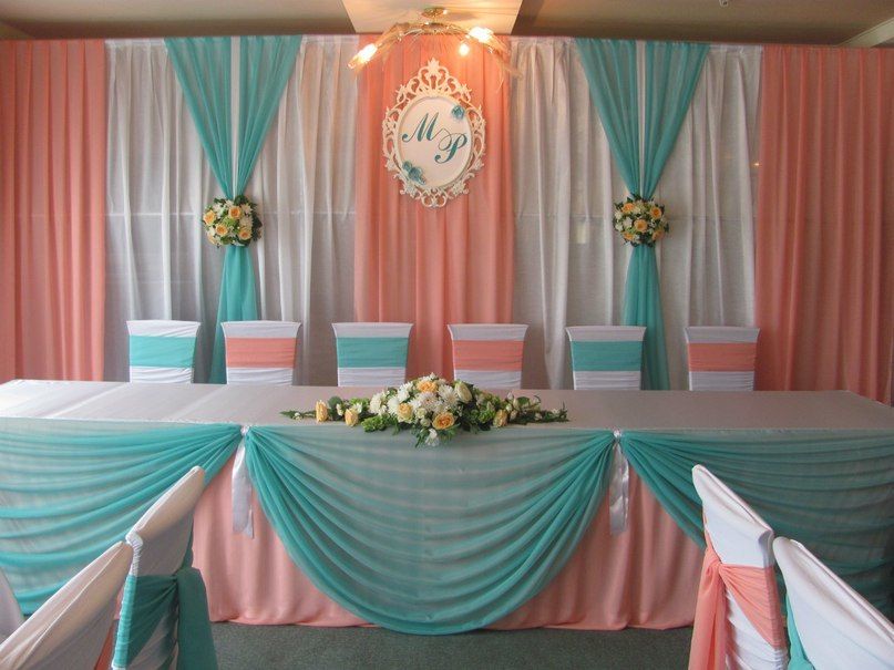 Con la ayuda de piezas de tela, puede ubicar visualmente el salón festivo. Por ejemplo, se crea una zona con mesas, un área separada para el baile y el entretenimiento, así como un lugar donde puede tomar fotografías para la memoria.