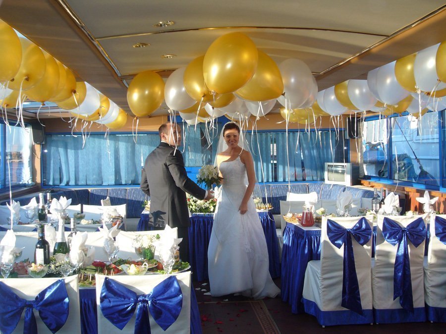 Los globos son familiares para todos desde la infancia. Este es un atributo invariable de cualquier día festivo, entonces, ¿por qué no usarlo para decorar el salón de bodas? Para la decoración, puede usar bolas o formas ordinarias. Estas pueden ser siluetas de cisnes o anillos de la novia y el novio, figuras de la novia y el novio.A menudo, las bolas simplemente corren hacia el techo, los productos de helio que se atan en la cinta cerca de las mesas de los novios se ven bastante originales. Otra idea es colocar globos ordinarios en una cuadrícula que está montada en el techo. Con el inicio de un momento romántico, por ejemplo, durante el primer baile de los jóvenes, la red se desata y las bolas se vaporizan maravillosamente, y luego permanecen en el suelo.
