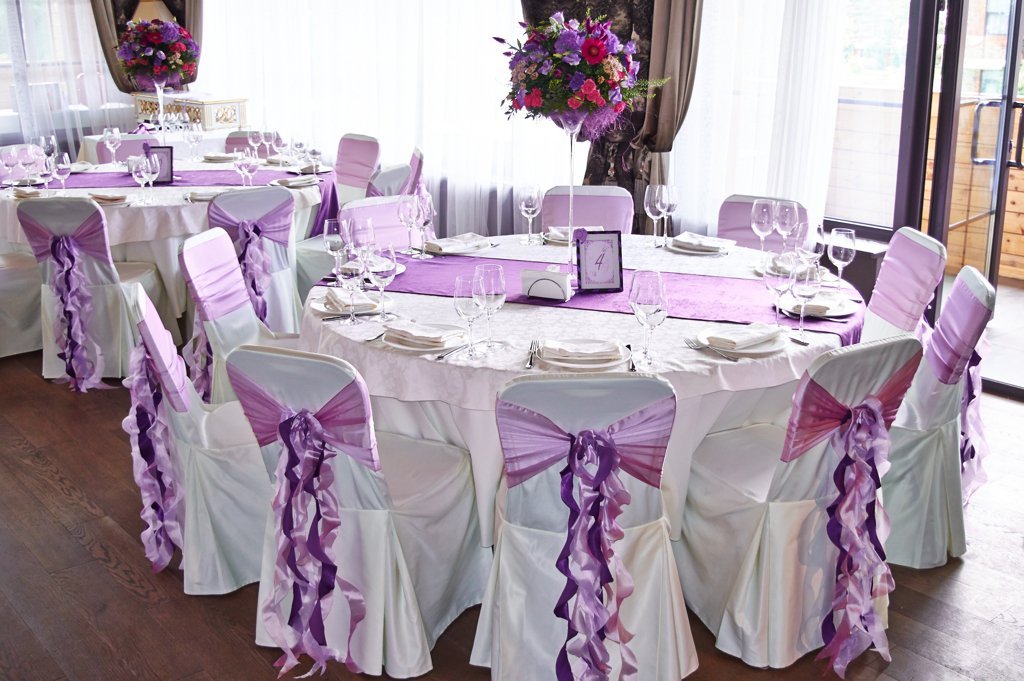 Las sillas en el restaurante pueden ocultarse con cubiertas blancas si se ven completamente deprimentes. En todos los demás casos, la tarea del decorador es enfatizar la belleza de los muebles. Para hacer esto, puede atar varias cintas o cuentas. Será apropiado colocar en la parte posterior un pequeño ramo de flores silvestres, si corresponde al estilo del evento.