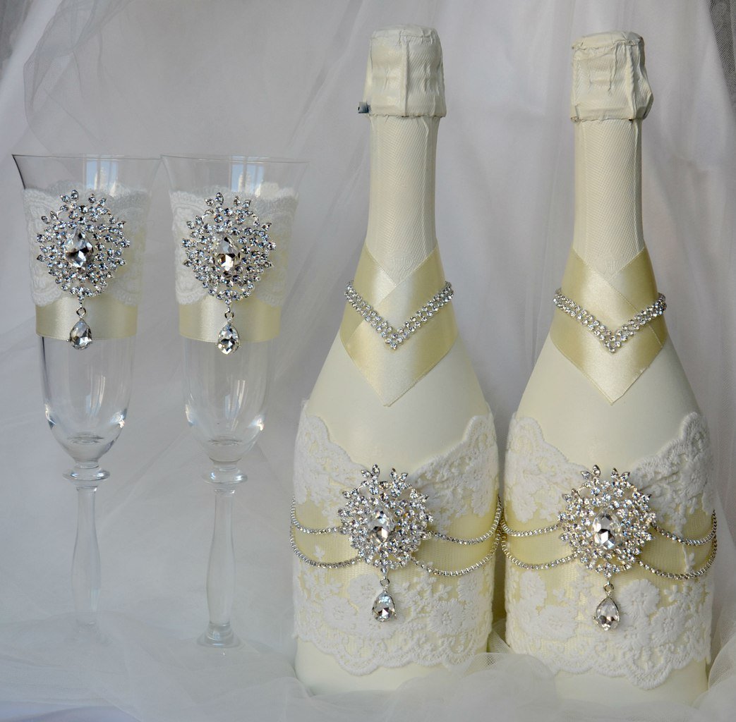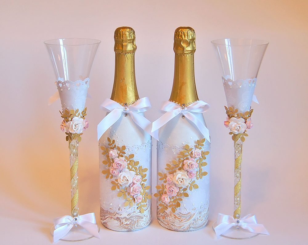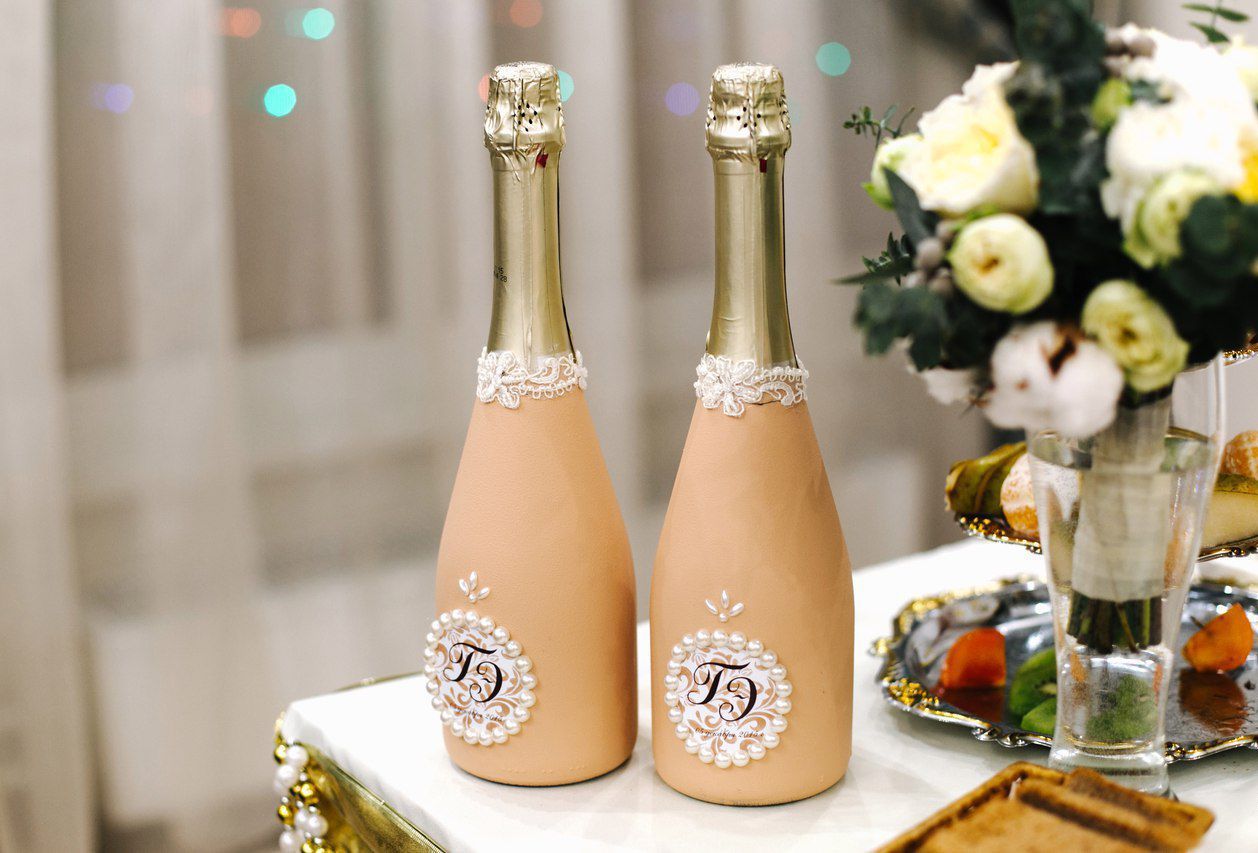 Para la celebración, es costumbre pedir varias botellas especialmente diseñadas, decoradas al estilo de los novios, alcohol, que se beberán en el primer y quinto aniversario de bodas. En los salones de bodas, estas botellas son bastante caras, por lo que puede hacerlas usted mismo.Al elegir materiales para la decoración, debe adherirse a los temas y colores principales de la celebración. Hay varias opciones de diseño: