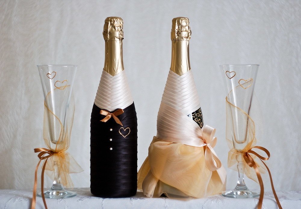 Para hacer esto, use una pistola de pegamento y cintas de raso en varios colores. El trabajo comienza con el cuello de la botella. Para hacer esto, la cinta se aplica oblicuamente para que un borde se superponga al otro, un centímetro. Los bordes de la cinta están pegados. Entonces, en etapas, debe pegar sobre todo el cuello. En el lugar donde la botella deja de biselarse, las cintas se pegan de manera uniforme. En el curso del trabajo, el color de la cinta debe cambiarse, imitando los trajes de los novios. Las irregularidades del trabajo pueden ocultarse con la ayuda de elementos decorativos brillantes.
