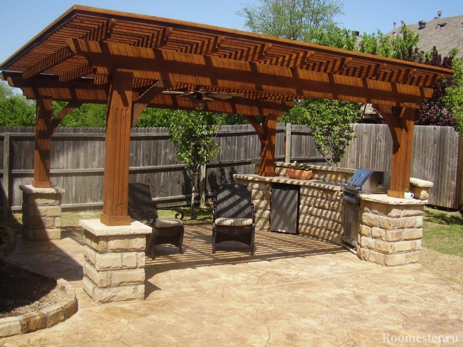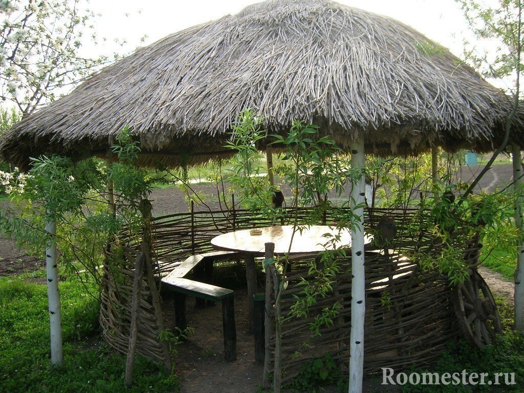 Cubiertos con manchas o pintura para carpintería exterior, se colocan tablas y barras en bancos, pequeñas formas de jardín: cenadores, arcos, pérgolas, toldos para uvas.
