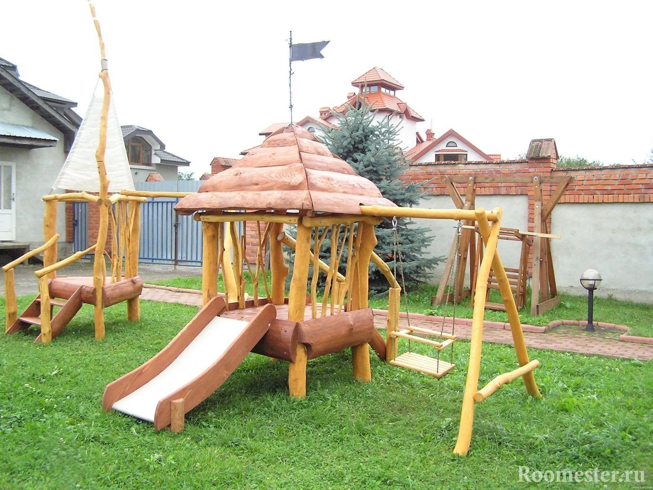Decoración con formas naturales. En esta opción, las partes desolladas de los troncos con un trasero y raíces gruesas se utilizan para la fabricación de bancos de jardín, comederos para pájaros, los cimientos de las casas de los niños al estilo de los cuentos populares rusos y el diseño de parques infantiles.