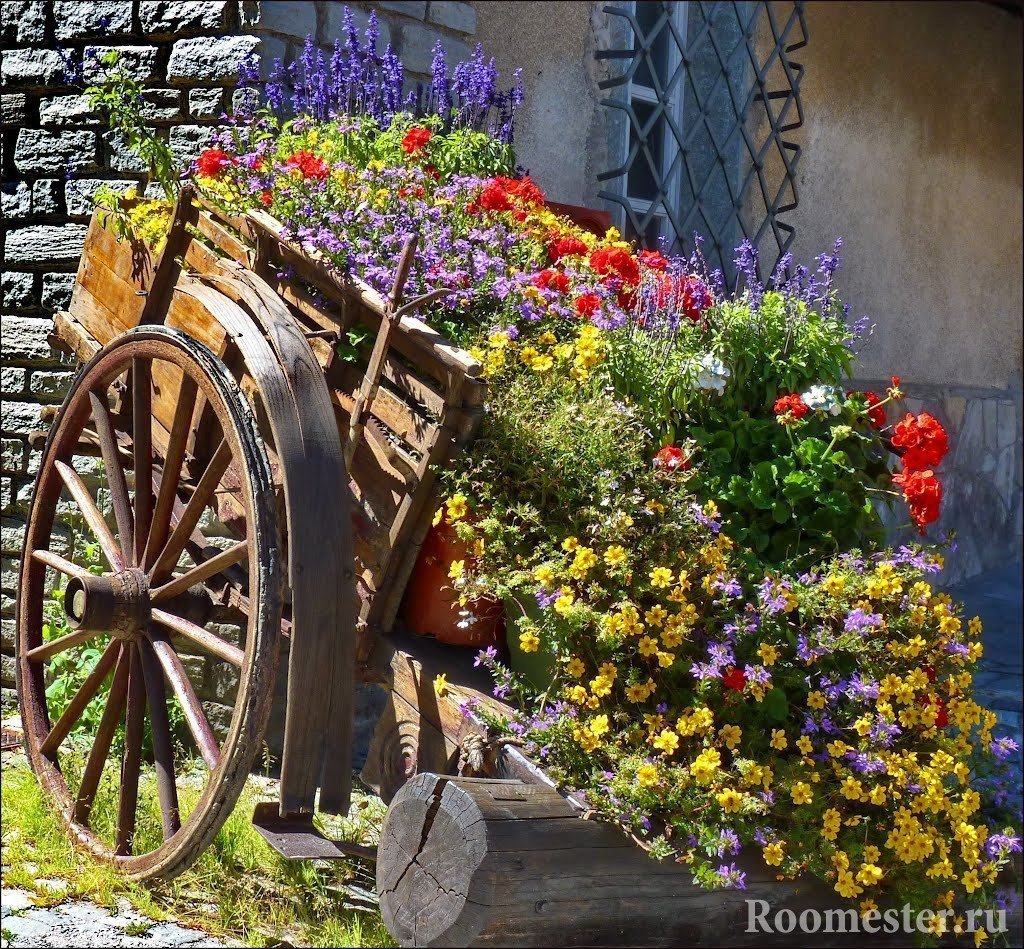 La habilidad especial requerirá la creación de un carro ligeramente inclinado para plantas y calabazas decorativas, desde el cual las petunias en flor o las "linternas" de calabaza se vierten al suelo con una brillante cascada.