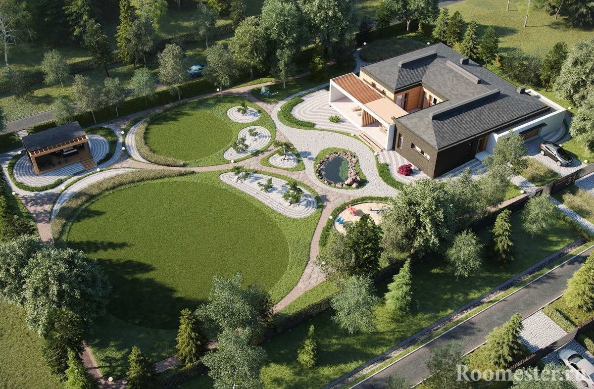 La decoración de todo el sitio se basa en sus características (forma, división en zonas, elevación, verticales predominantes, grupos existentes de espacios verdes), teniendo en cuenta la vista desde la ventana de la habitación central o su habitación favorita en la casa, en función de sus propios pasatiempos y capacidades financieras.