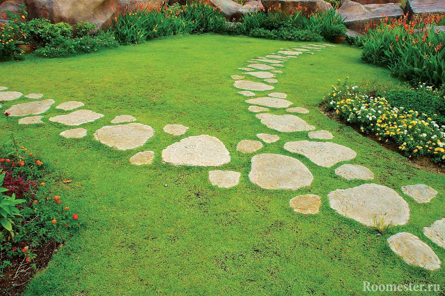 piedra con un marco de césped (alrededor de las piedras planas principales en una capa de césped de tierra se planta, que se corta junto con el césped);