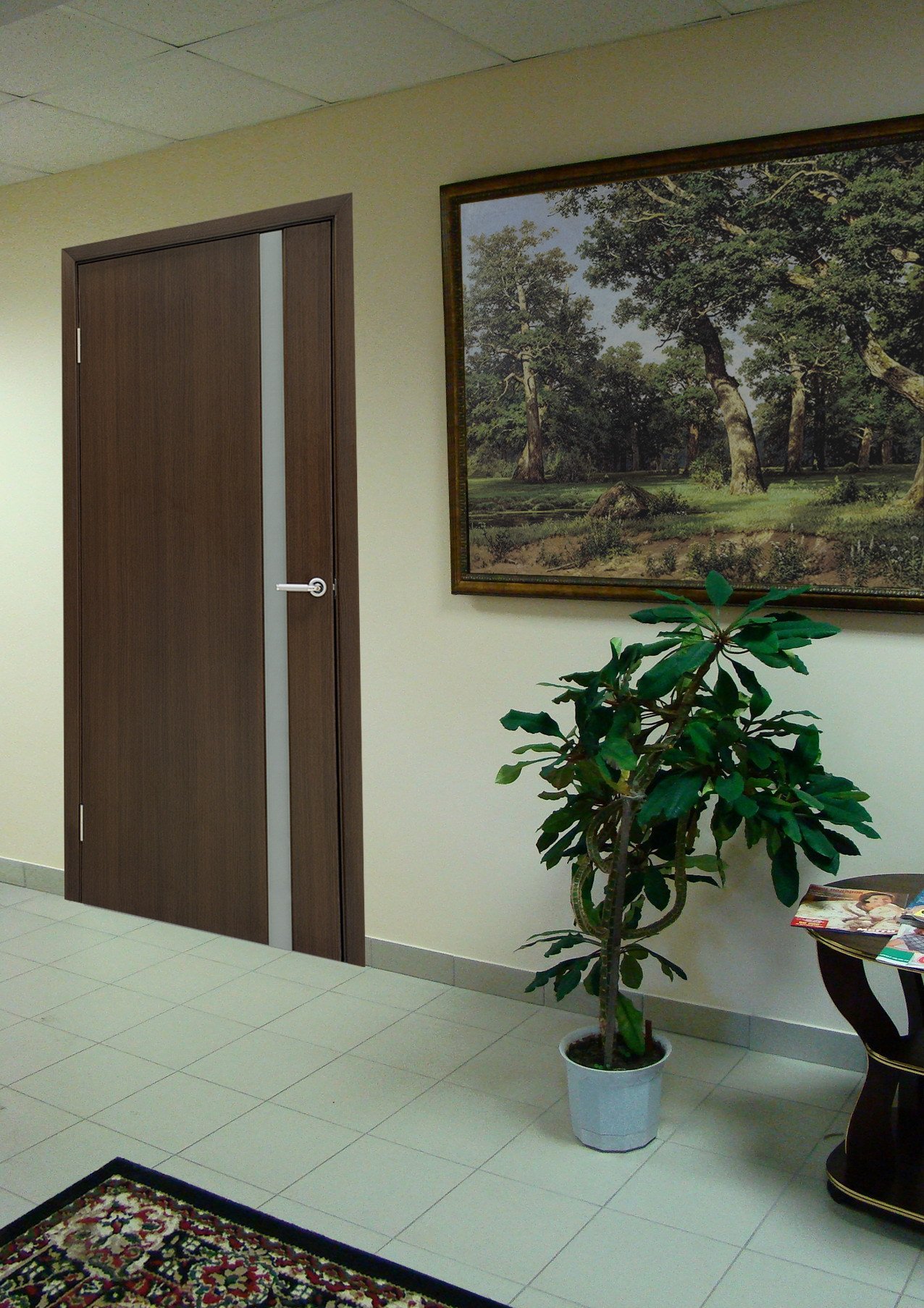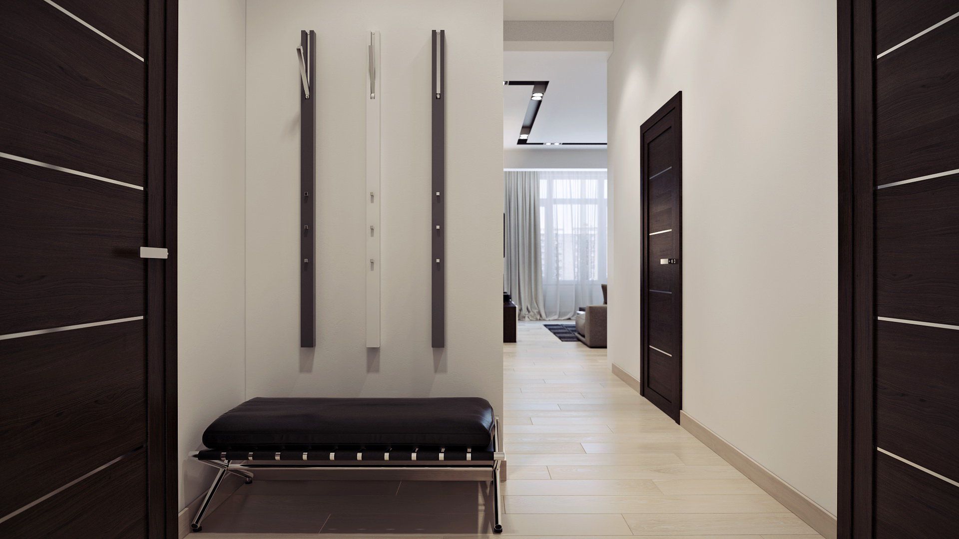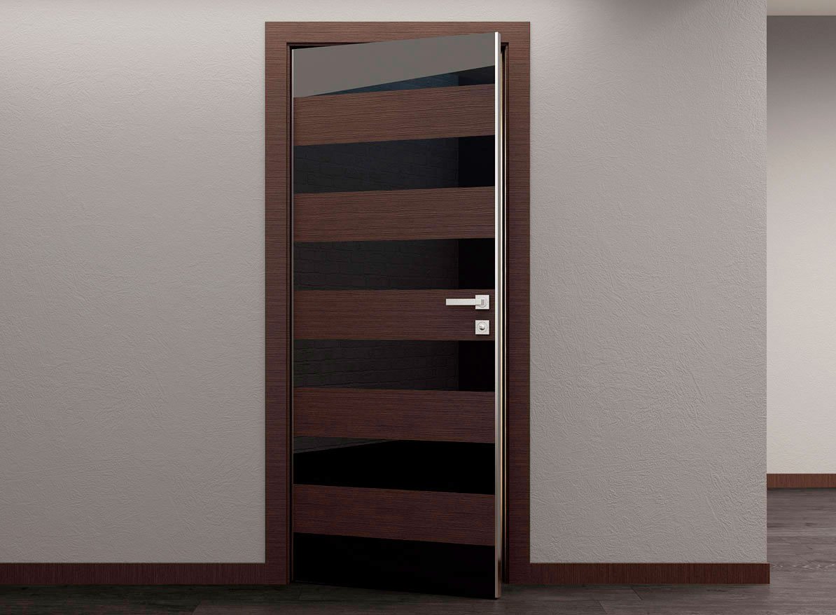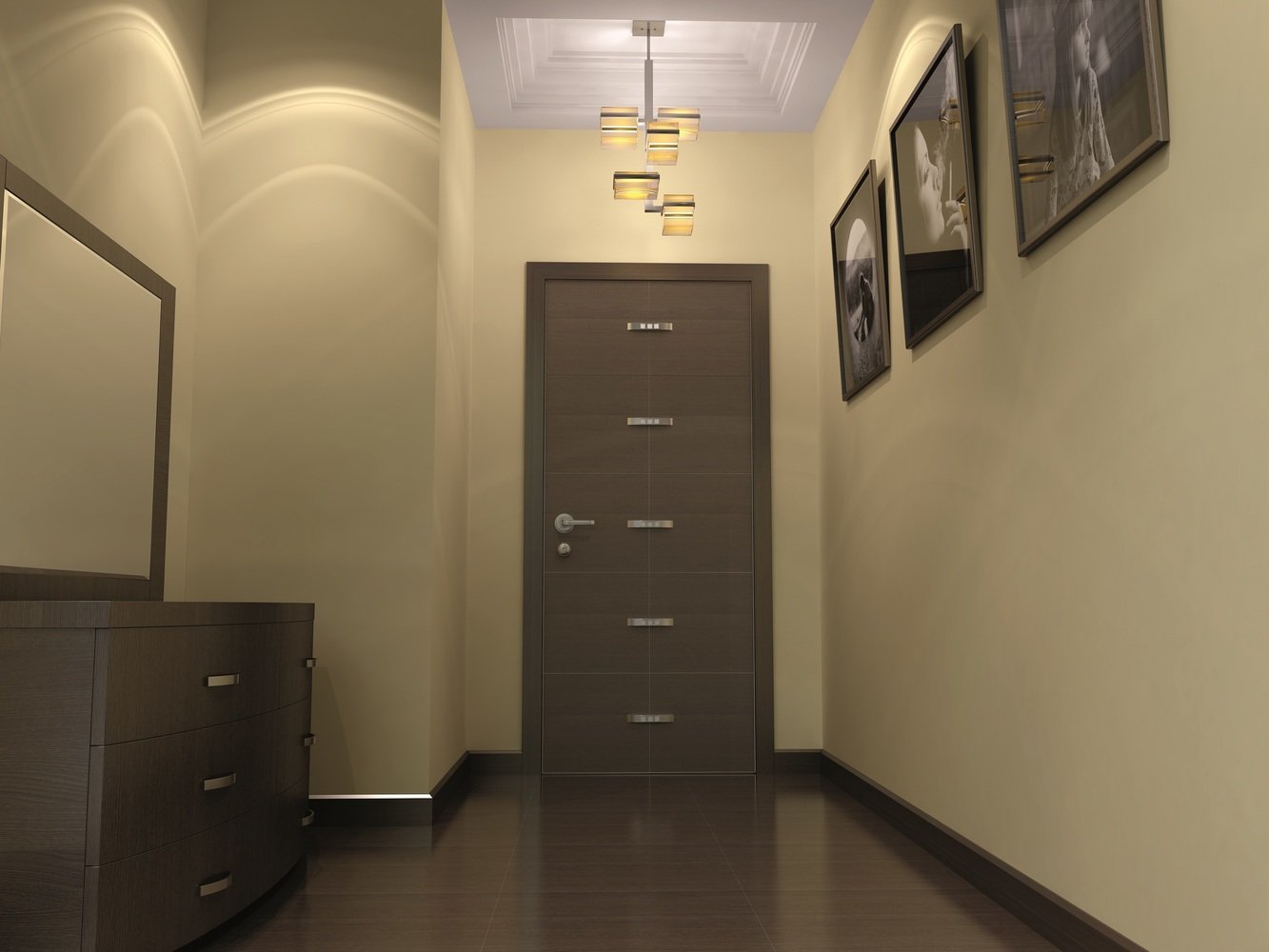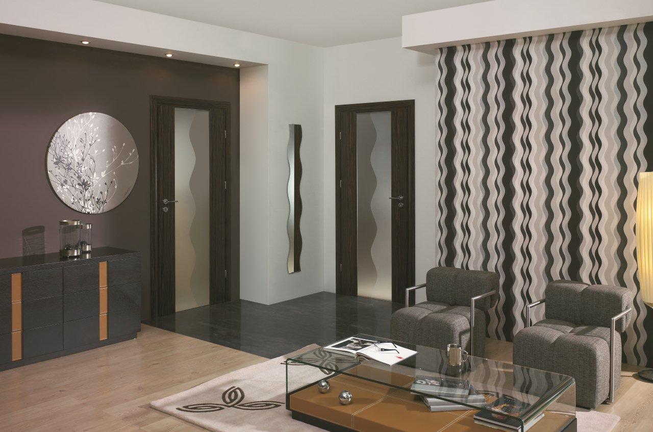 moderno: se hace hincapié en las puertas anchas, que están decoradas con rayas horizontales de color marrón-negro, hay techos elásticos ligeros, inserciones de vidrio sobre las puertas;