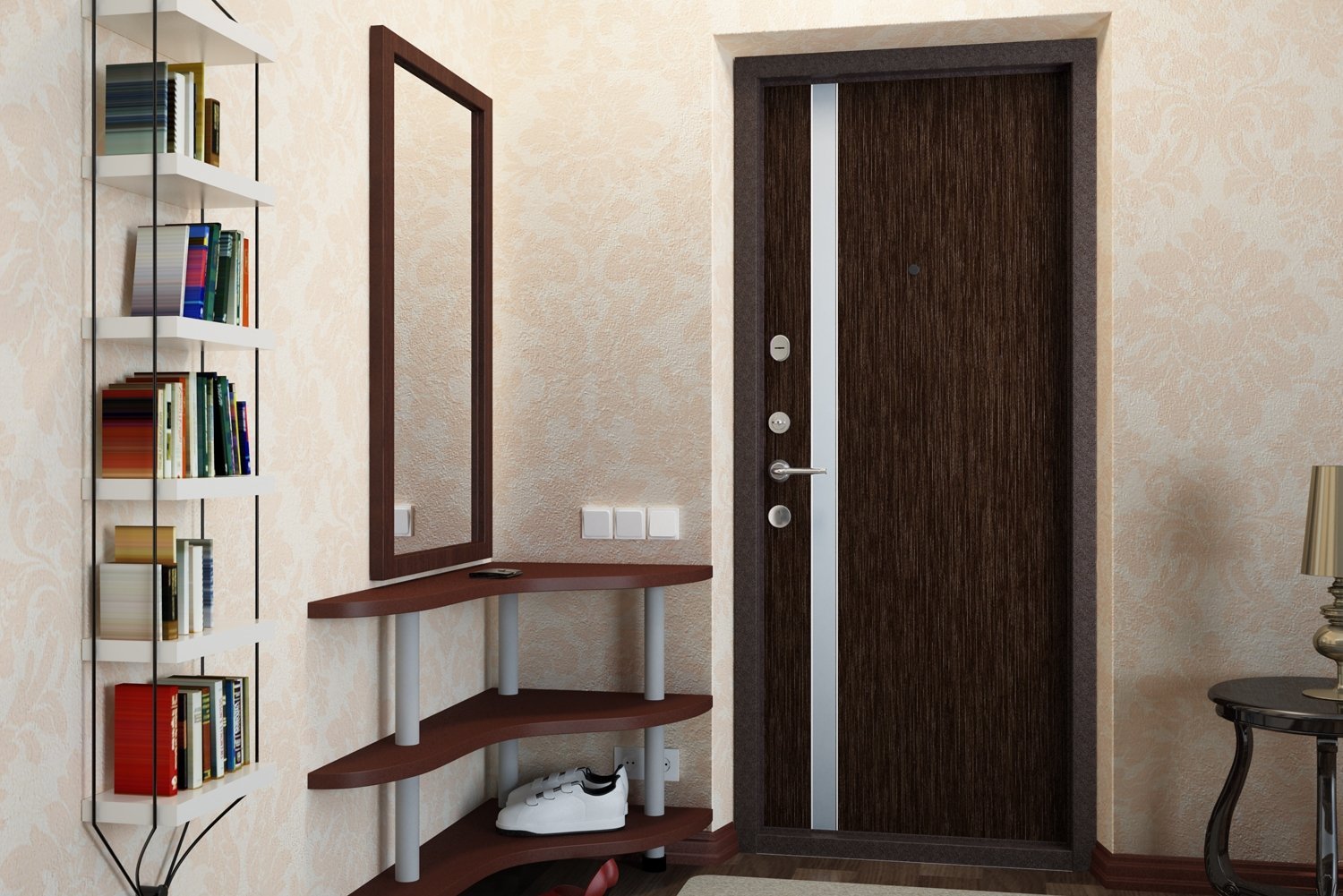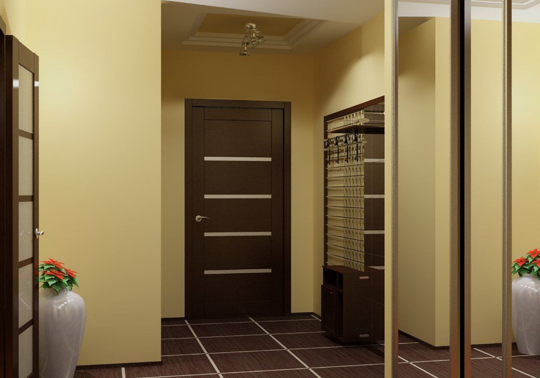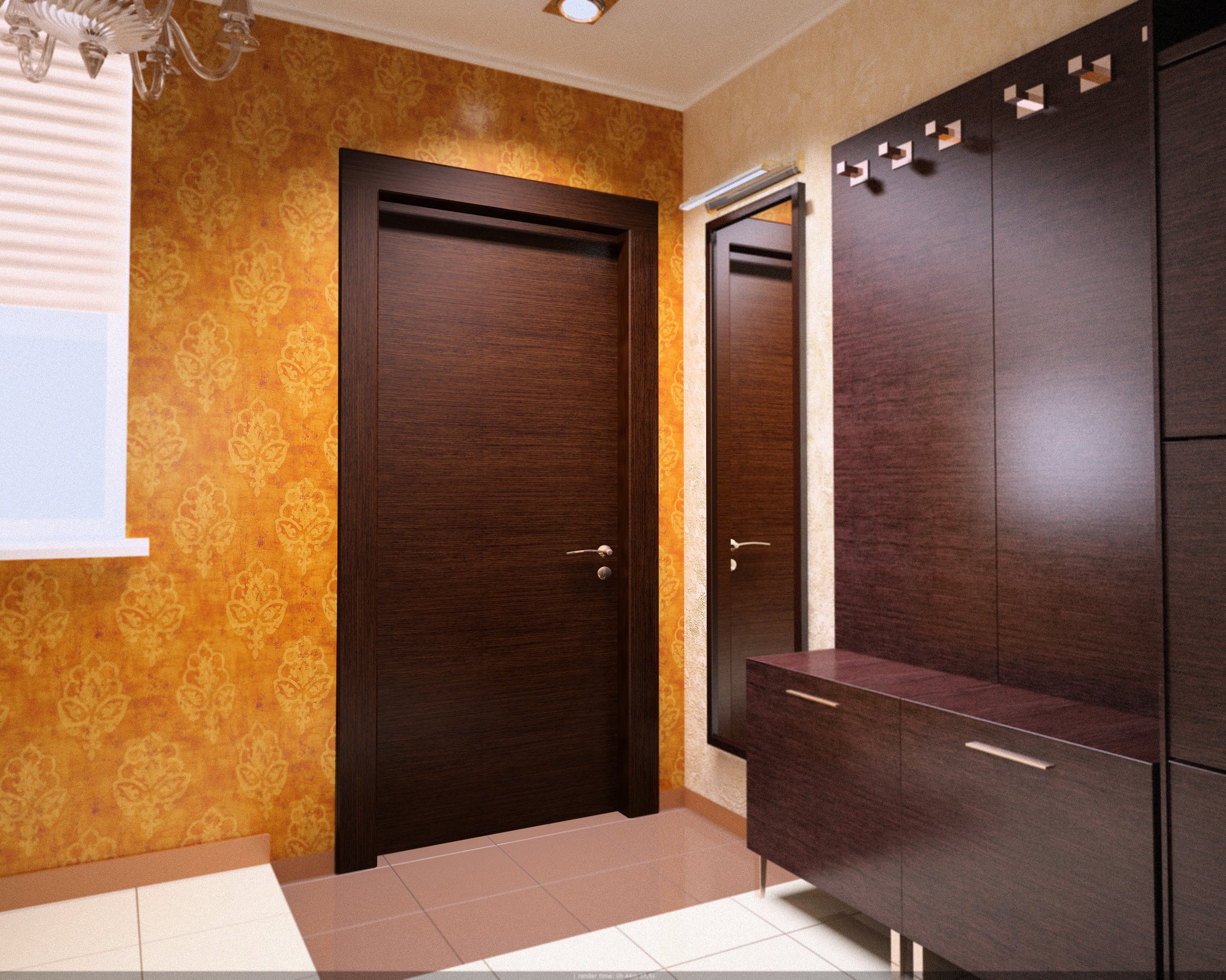 Si las hojas de la puerta tienen vidrieras, muchos patrones, varios insertos metálicos, el papel tapiz se selecciona en el mismo color y viceversa, una simple puerta marrón se ve ventajosamente en un fondo moderadamente colorido. El papel pintado a veces pega simultáneamente dos tipos, pero diferentes texturas, colores y patrones. Por ejemplo, dos tercios de las paredes de la habitación están cubiertas con lienzos anchos de color beige verdoso en una pequeña flor, y más estrechos, con grandes elementos vegetales, están pegados entre ellos. Otra opción es el papel tapiz gris liso en tres paredes y coloridos murales fotográficos en la pared del fondo, frente a la puerta ancha.