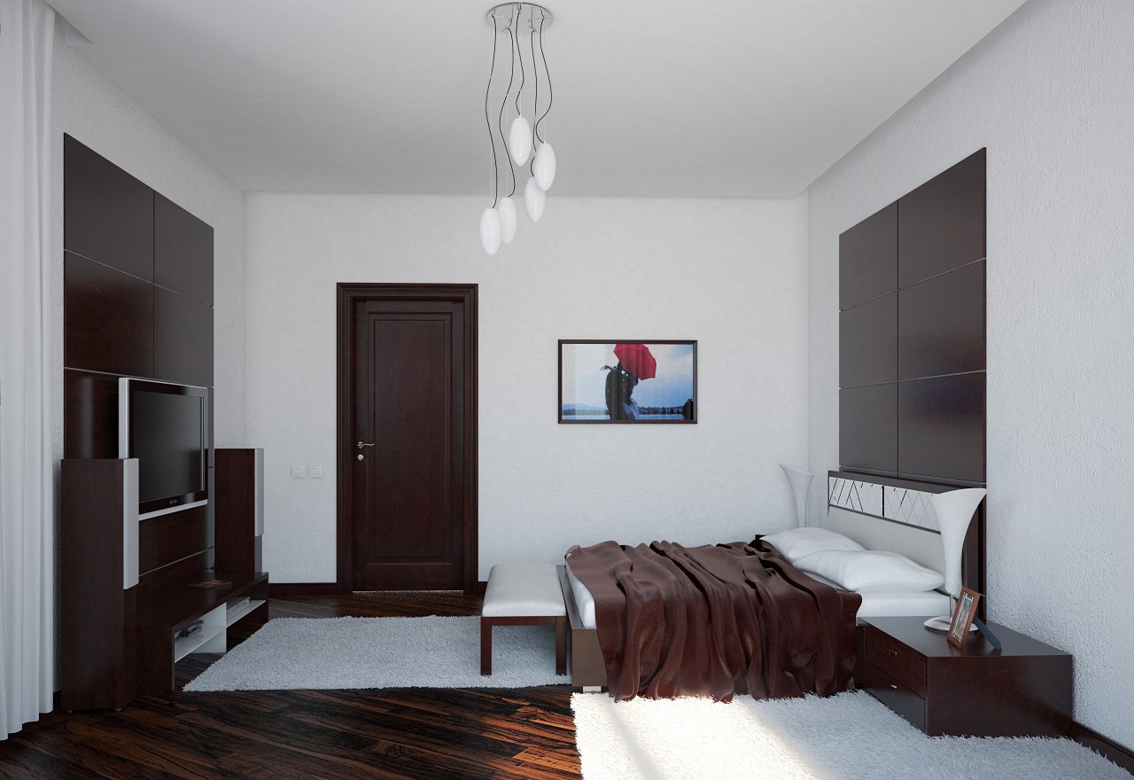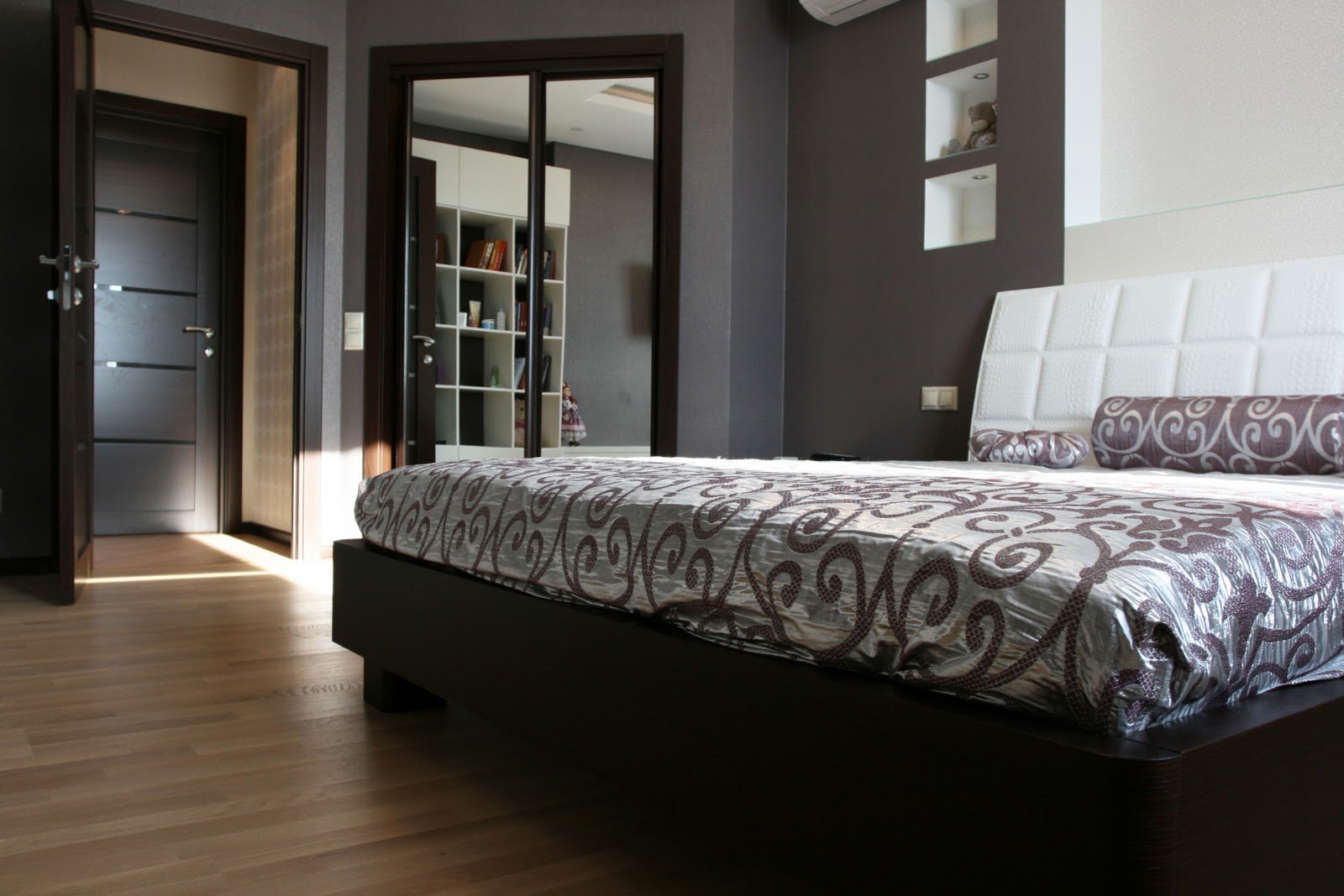 kontemporari: habitaciones sencillas y confortables, cuyas entradas y salidas están decoradas con puertas de wengué funcionales, con una variedad de patrones duplicados en armarios empotrados, cómodas;