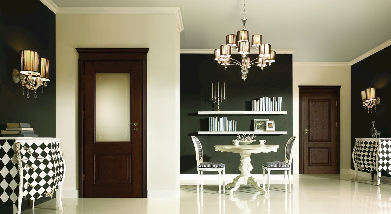 El esquema de color "clásico" es inserciones blancas de vidrio u otra madera en un solo lienzo de wengué. Tal solución decorará casi cualquier interior.