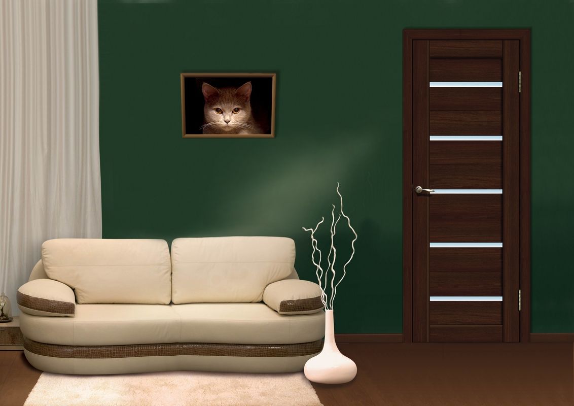 El papel tapiz siempre se selecciona más claro que las hojas de las puertas: para habitaciones pequeñas y mal iluminadas con ventanas al norte, se prefiere blanco, beige, arena, ocre. Las espaciosas habitaciones con ventanas hacia el sur "gustarán" los colores fríos: turquesa, azul, violeta, verde pálido. El complemento ideal para el interior "costoso" será murales de vinilo o seda con imágenes de bosque de verano, puesta de sol en el mar, paisajes rurales o animales. Si las hojas de la puerta tienen vidrieras, muchos patrones, varios insertos metálicos, el papel tapiz se selecciona en el mismo color y viceversa, una simple puerta marrón se ve ventajosamente en un fondo moderadamente colorido. El papel pintado a veces pega simultáneamente dos tipos, pero diferentes texturas, colores y patrones. Por ejemplo, dos tercios de las paredes de la habitación están cubiertas con lienzos anchos de color beige verdoso en una pequeña flor, y más estrechos, con grandes elementos vegetales, están pegados entre ellos. Otra opción es el papel tapiz gris liso en tres paredes y coloridos murales fotográficos en la pared del fondo, frente a la puerta ancha.