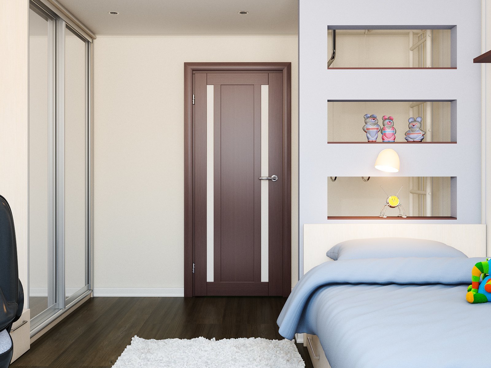 en el dormitorio: tiene características de insonorización, puede quedarse dormido fácilmente detrás de esa puerta, incluso si alguien hace ruido en otra habitación, se recomiendan colores claros y relajantes;