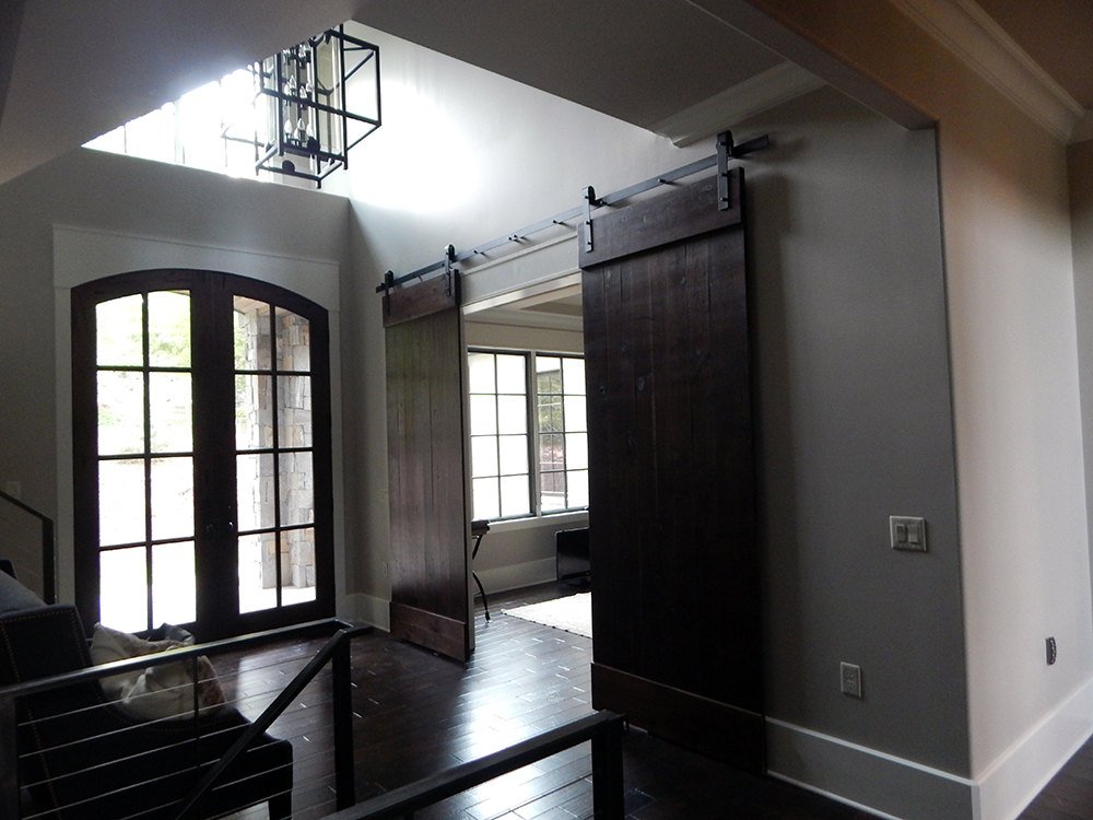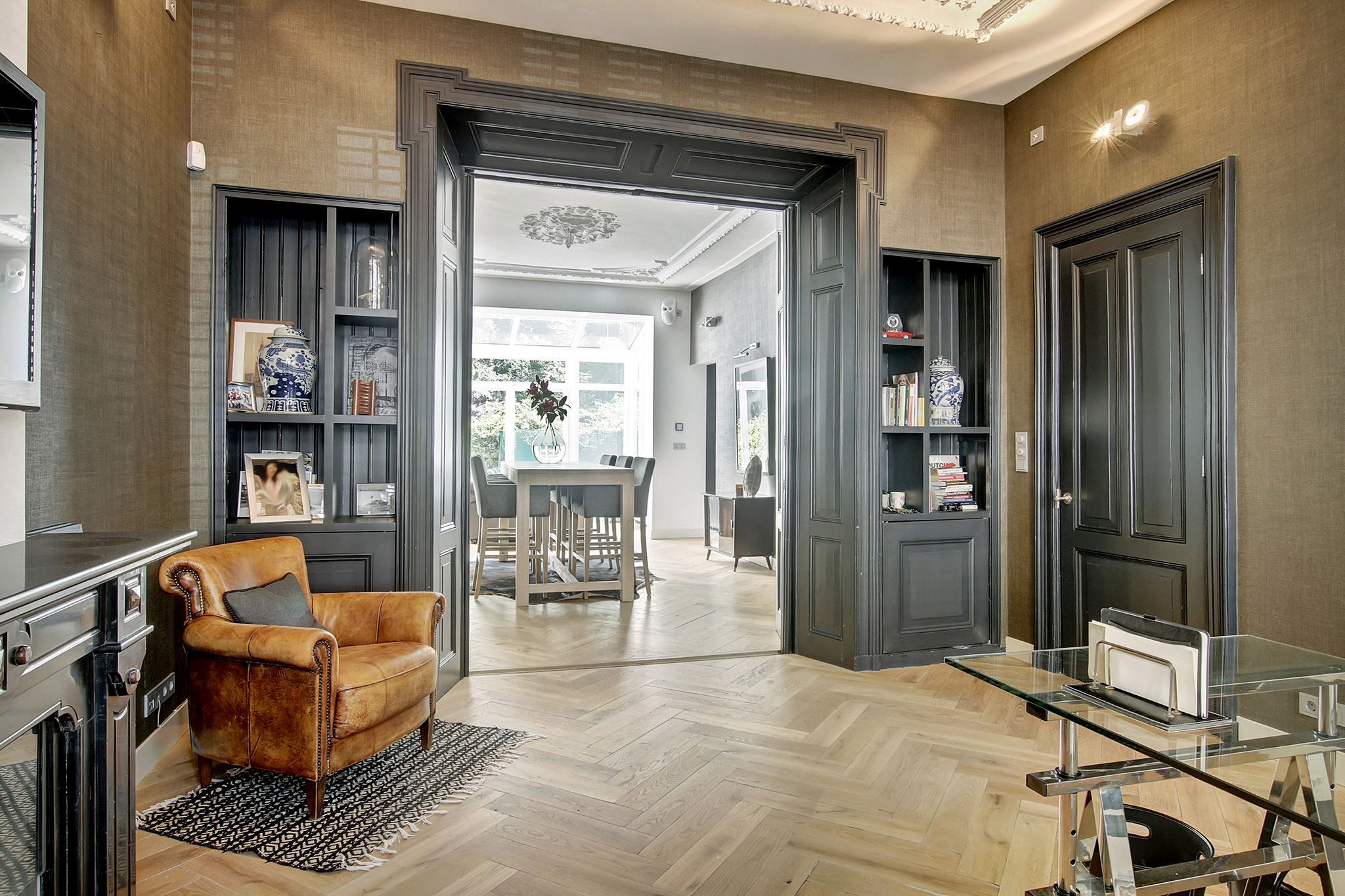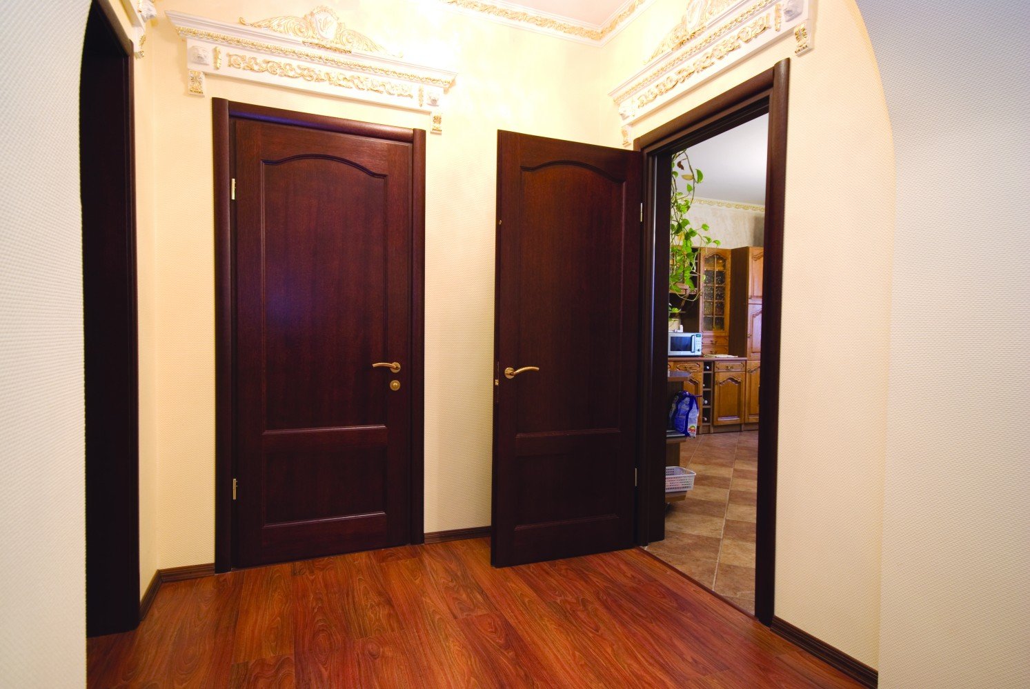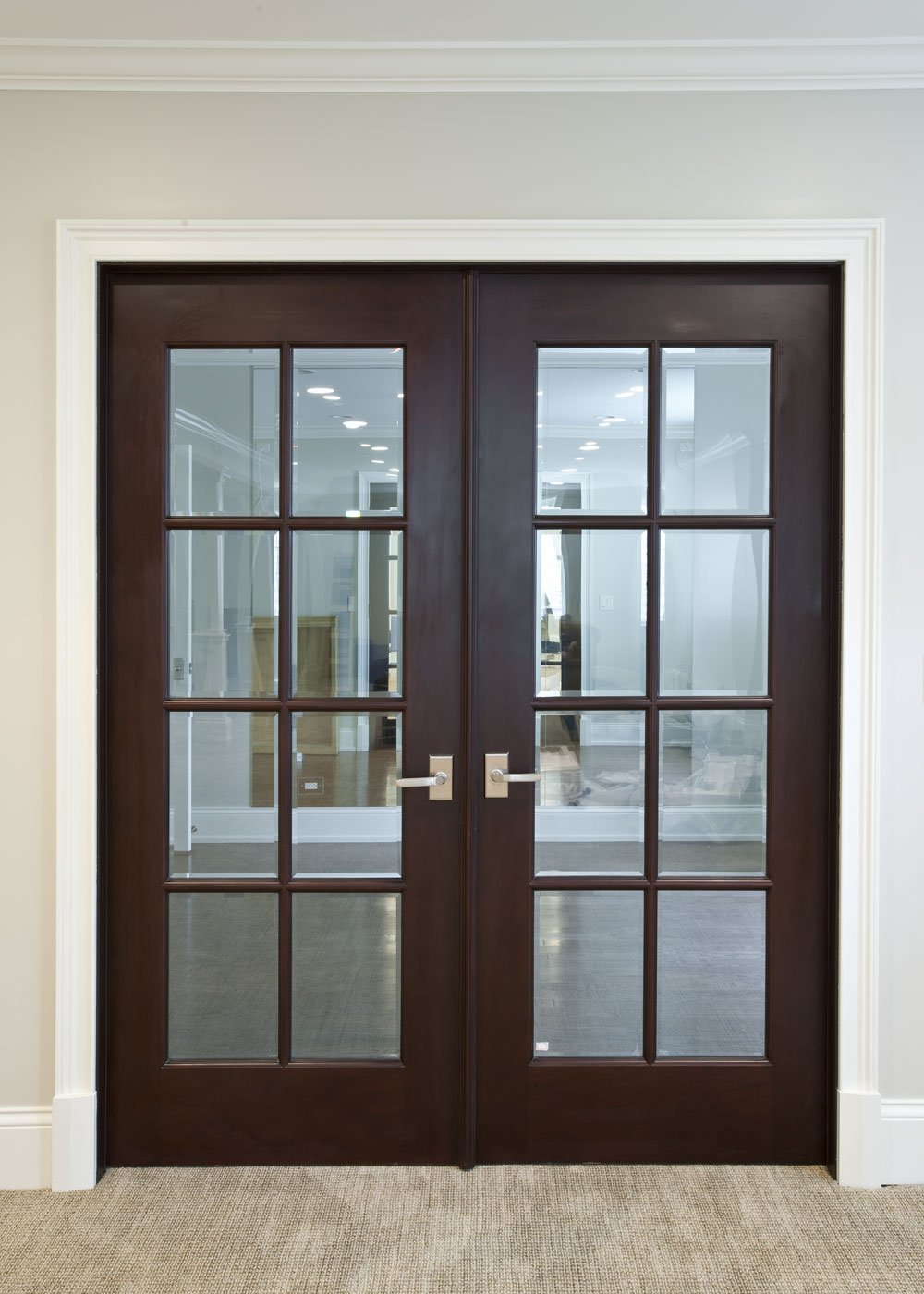 Puertas oscuras esmeriladas y pisos brillantes en las habitaciones.