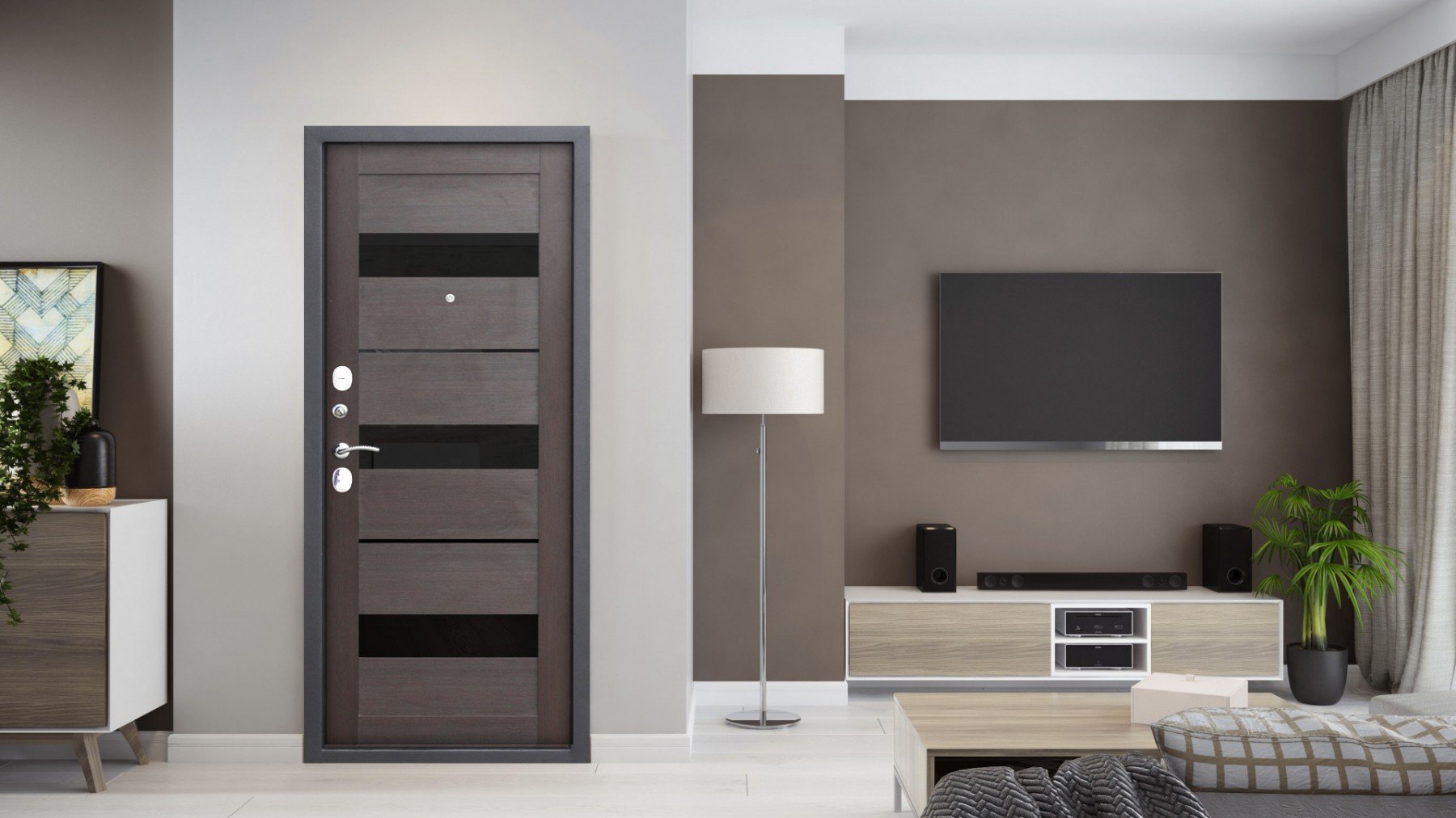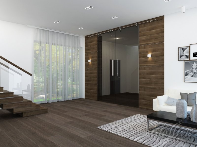 Otro de los ejemplos más exitosos del uso de una paleta oscura de puertas interiores. Cuando se toma como base un color nítido y saturado, como el motivo principal en el piso y en la paleta de las aberturas que rodean la sala. El efecto lacado suaviza y llena perfectamente la superficie con brillo y significado. Es mejor organizar el piso en tonos más suaves, ceniza, gris, la puerta es negra, marrón, wengué maduro, otro color, de acuerdo con su gusto.