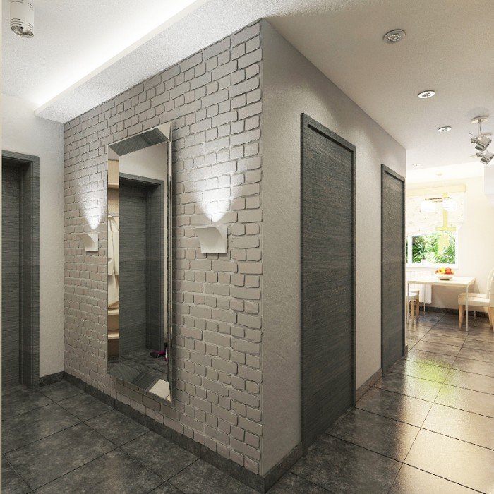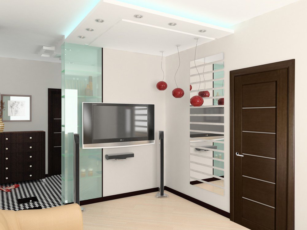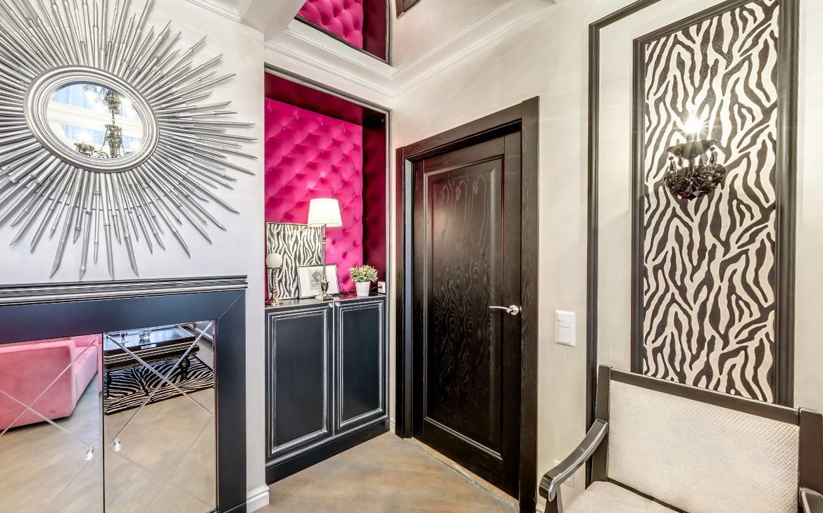 Si desea instalar una opción de puerta de este tipo en un apartamento pequeño, los espejos desempeñarán un papel importante para aumentar el espacio, por ejemplo: un armario o pinturas de espejo en la pared.