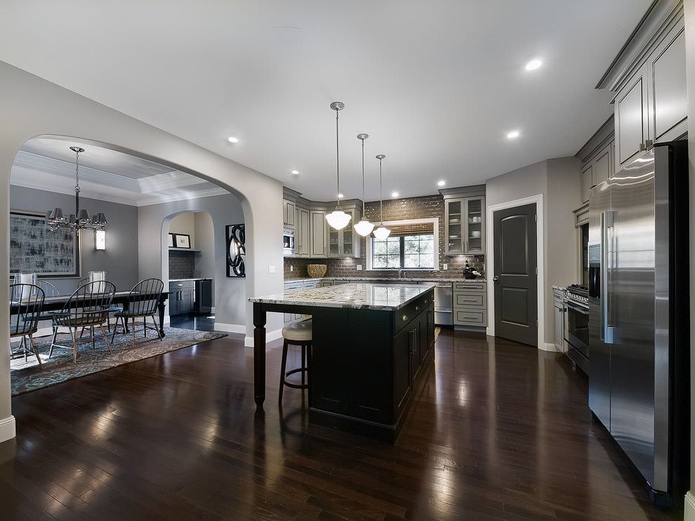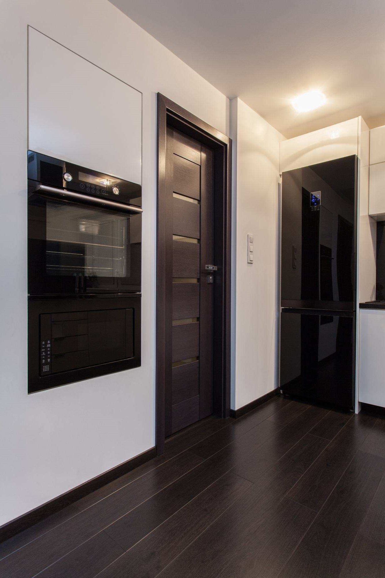 En la cocina, una puerta oscura parece efectiva si la imagen general es blanca o pastel, si hay una mesa blanca, fregadero, estufa, vajilla blanca, el interior de la cocina se convertirá en un tablero de ajedrez en la casa. Un avance maravilloso y clásico de las habilidades de los diseñadores. La cocina en blanco y negro es bastante popular hoy en día.En presencia de impregnaciones brillantes en los colores generales, así como revestimientos plateados y dorados (muebles, refrigerador), la entrada oscura será muy bienvenida. El efecto triplex: vidrio interno incorporado, también es una idea positiva para la cocina, un óvalo o cuadrado de vidrio agregará belleza a las puertas y aumentará aún más el espacio.