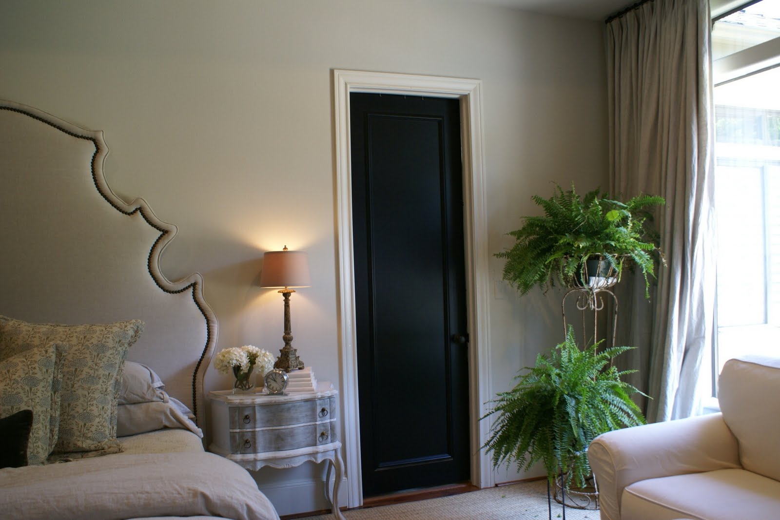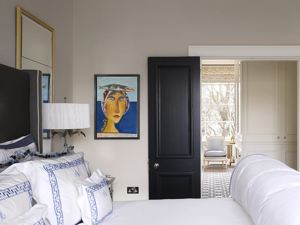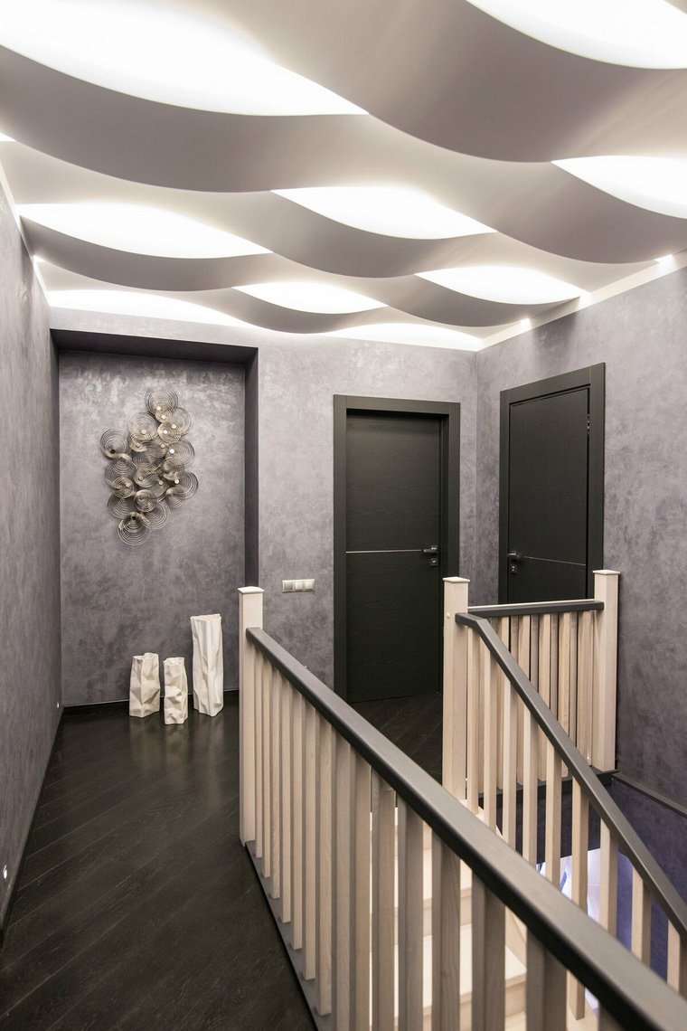 Hablando de las ventajas del color profundo en el interior, parece: espacio, misterio, grandeza, infinito. Y si usa el tono negro de muebles y textiles correctamente, puede obtener el efecto de profundidad e infinito. Por lo tanto, la instalación de puertas oscuras es una oportunidad real no solo para cumplir un sueño, sino también para aumentar el espacio de esta manera. Digamos, una banda marrón pasa a la línea del azul celeste del fondo de pantalla, creando así el efecto de un "vuelo" del techo.