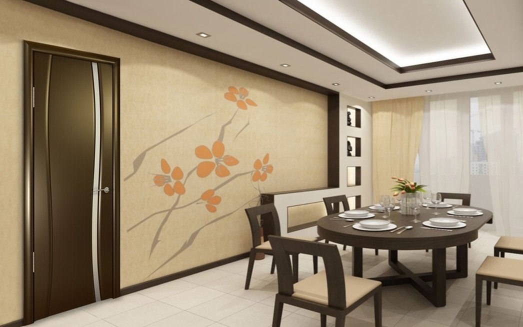 Uno de los grandes ejemplos de la idea cuando se usan puertas oscuras, cuya instalación gana el espacio general de las habitaciones en su conjunto. Un piso tranquilo dará profundidad, así como un papel tapiz ligero: el ancho de las paredes. Las puertas con tal diseño se verán geniales, desempeñando el papel de un "punto brillante", creando así un efecto aburrido. Junto con las cortinas que puede hacer de forma segura, con tonos escarlatas, verdes y azules (pero no sólidos, preferiblemente en forma de imagen, ondas, flores, etc.), así como muebles tapizados: cuero, felpa, este diseño obtendrá el aspecto más positivo y dará Comodidad para el hogar. La puerta se puede decorar con manijas de acero plateadas y doradas.