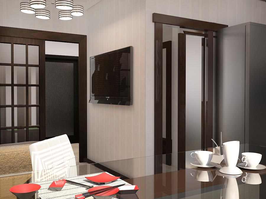 La puerta oscura es una defensa subconsciente, por lo tanto, siempre está en el podio de la popularidad. Cuando se queda en tonos marrones, azules, grises saturados, negros, no es necesario usar toda la paleta nublada en el color del papel tapiz o del piso. Es suficiente para establecer el tono principal, deteniéndose en las aberturas de entrada, muebles, accesorios. La habitación en ningún caso debe reducir su volumen, con un aspecto general, debido al color profundo, pero si se aplica correctamente, obtendrá el mismo diseño ingenioso que desea disfrutar todos los días. Por lo tanto, habiendo confiado en el color nocturno, es necesario involucrar a todas las partes en el refinamiento de la sala. A veces, los motivos negros dan un efecto sorprendente junto a los colores pastel, donde la tarea principal de los colores claros es aumentar el volumen, y los oscuros para completar la imagen, formando un borde, la integridad de la imagen.
