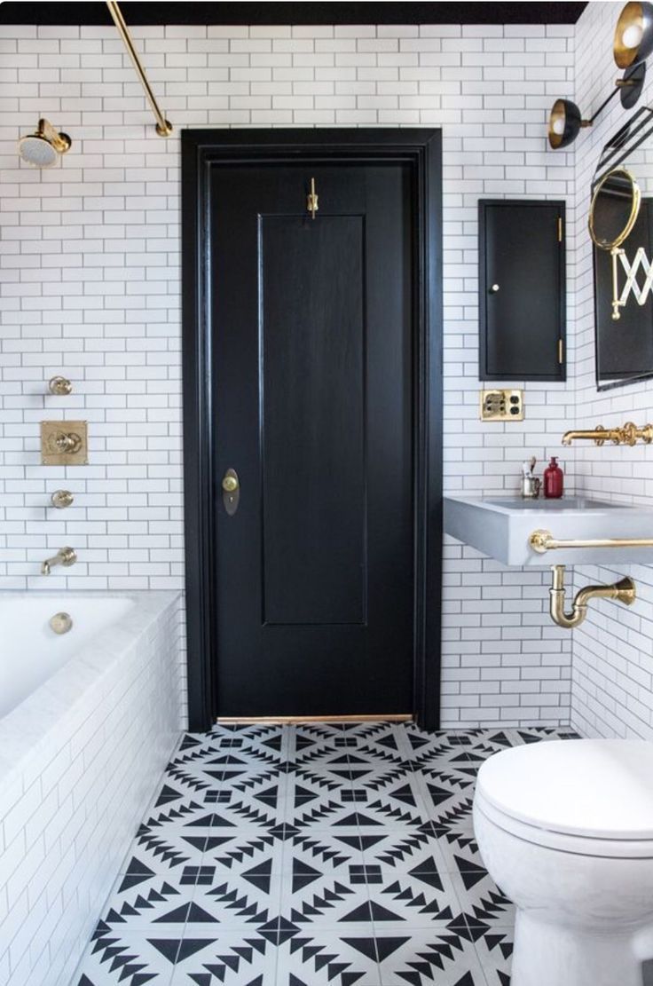 La puerta negra que abre el baño con brillantes colores blancos es una vista impresionante. En cada hora del baño disfrutarás de la comodidad y el juego de colores, la transición de la noche a la luz. En un baño así, será un placer relajarse, y debido a la presencia de azulejos azules, verdes y rosas en las paredes y focos, su baño se convertirá en el rincón más cómodo de la casa. Las decisiones más audaces también son aplicables, digamos: azulejos azules, puertas negras, pero el baño, el lavabo (y si hay un baño compartido, entonces el inodoro, el bidé) deben ser exclusivamente blancos, tonos pastel.