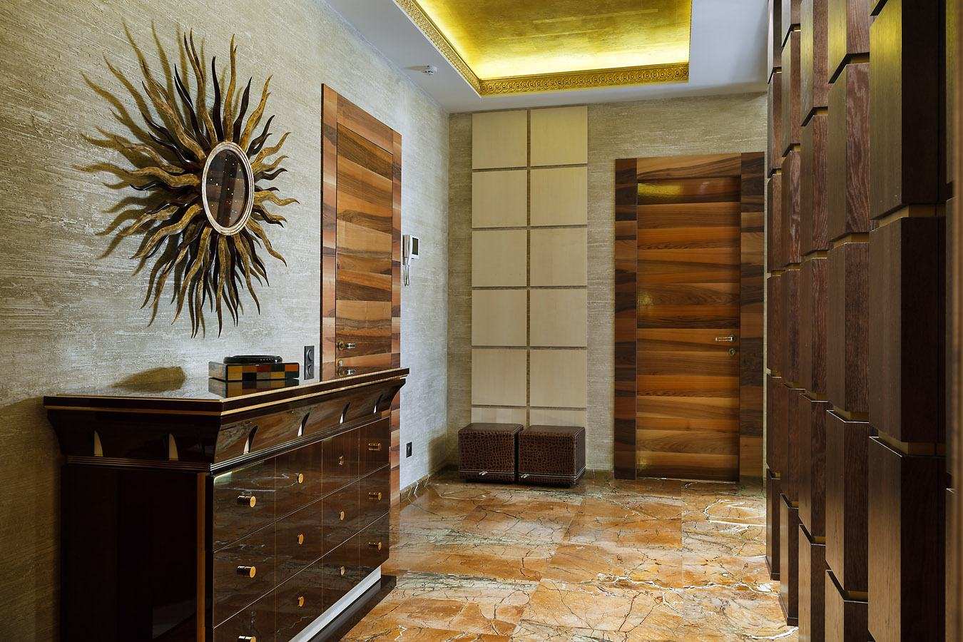 Puertas oscuras brillantes y piso oscuro en el pasillo