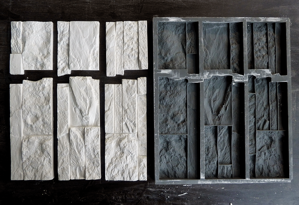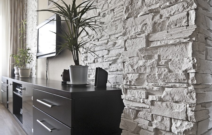 Imitación de piedra natural: los productos están disponibles en varios tonos y son casi indistinguibles del material natural. Especialmente populares son las baldosas de hormigón celular que transmiten la textura de la pizarra. Las soluciones especiales para colorear ayudan a lograr brillo. Las muestras de cemento de yeso, que se utilizan para decorar arcos, chimeneas y nichos, no son menos populares.