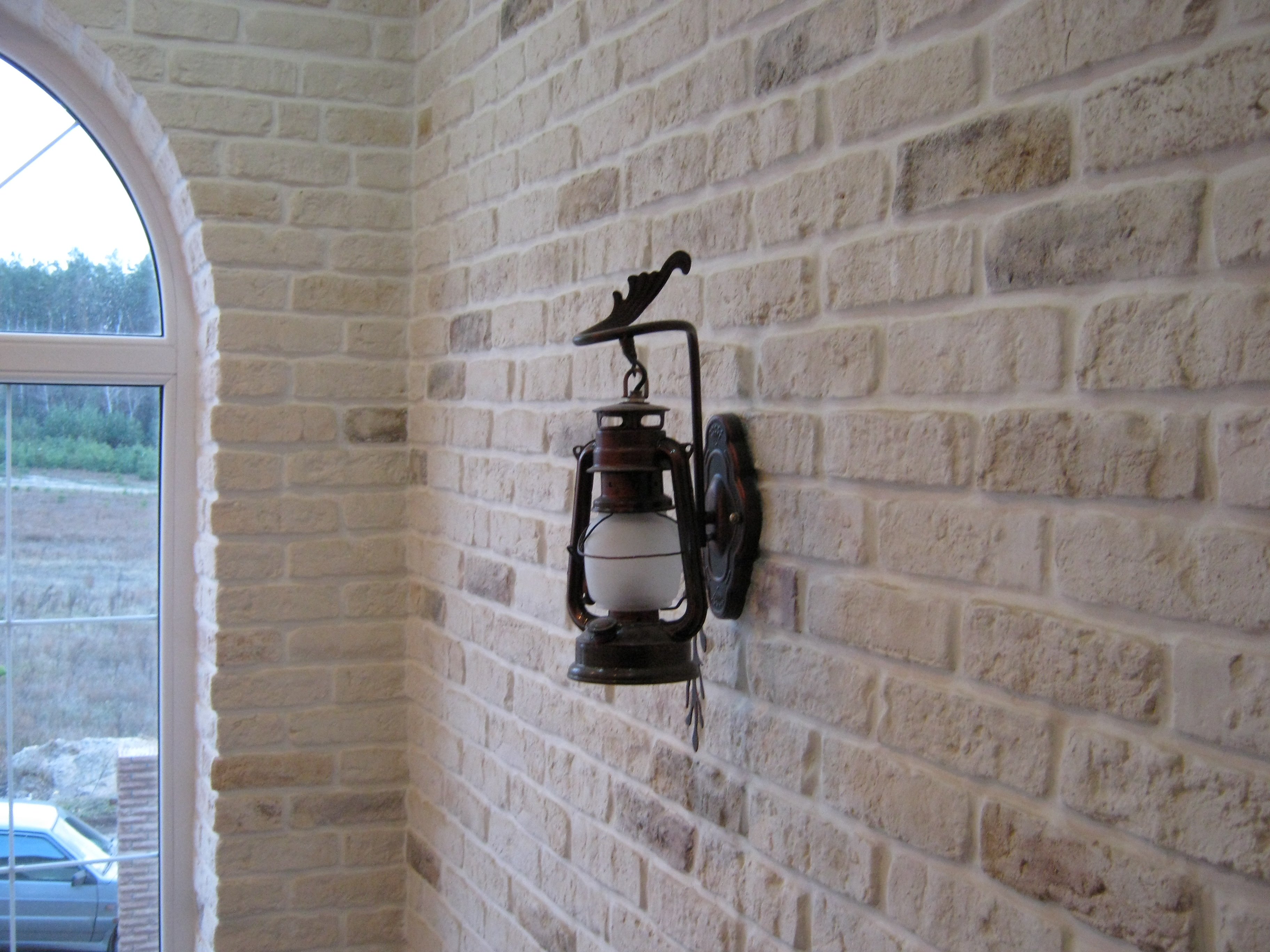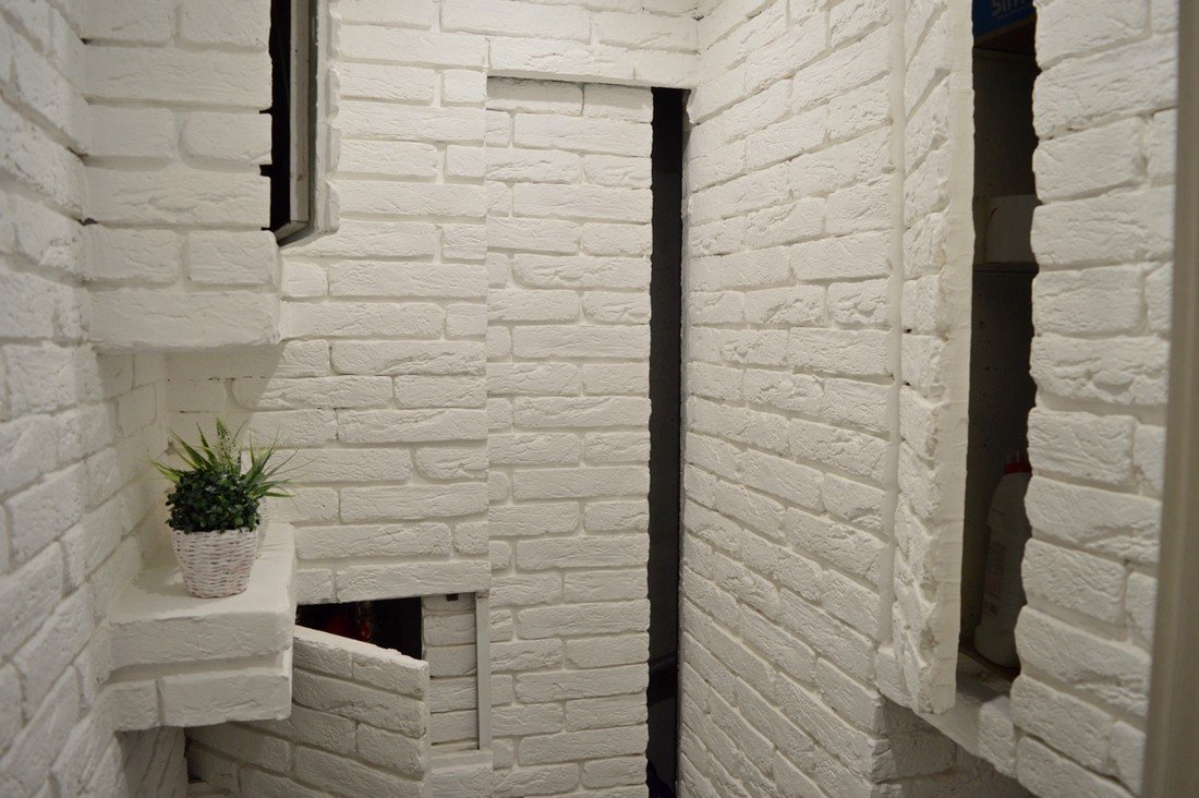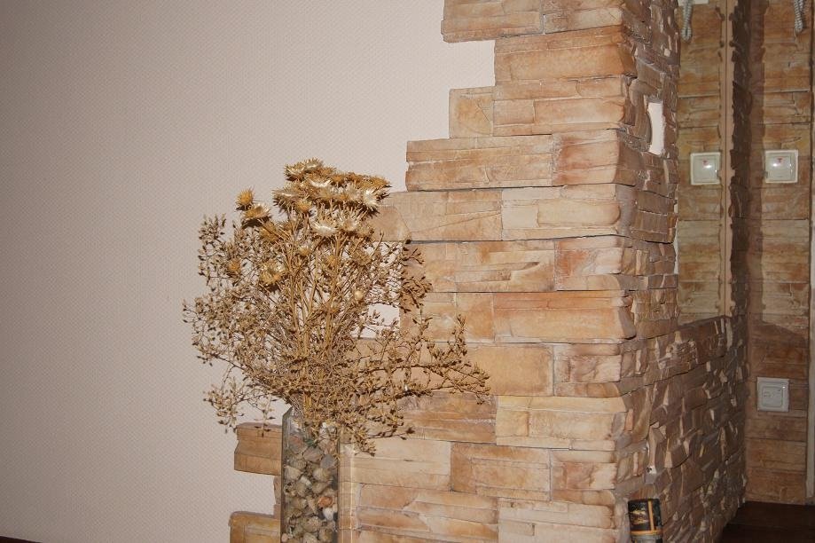 En el pasillo con ladrillos de yeso, alicataron una sección de las paredes cerca de la puerta, esquinas. El material se aplica en parte, simulando una piedra expuesta. Muy a menudo, los fragmentos se colocan con una escalera, o al azar, colocándolos en una posición horizontal. Para enmarcar la entrada del producto, se colocan perpendiculares a la puerta. Al terminar las secciones inferiores de las paredes adyacentes, la mampostería se realiza de acuerdo con el principio de ladrillo.