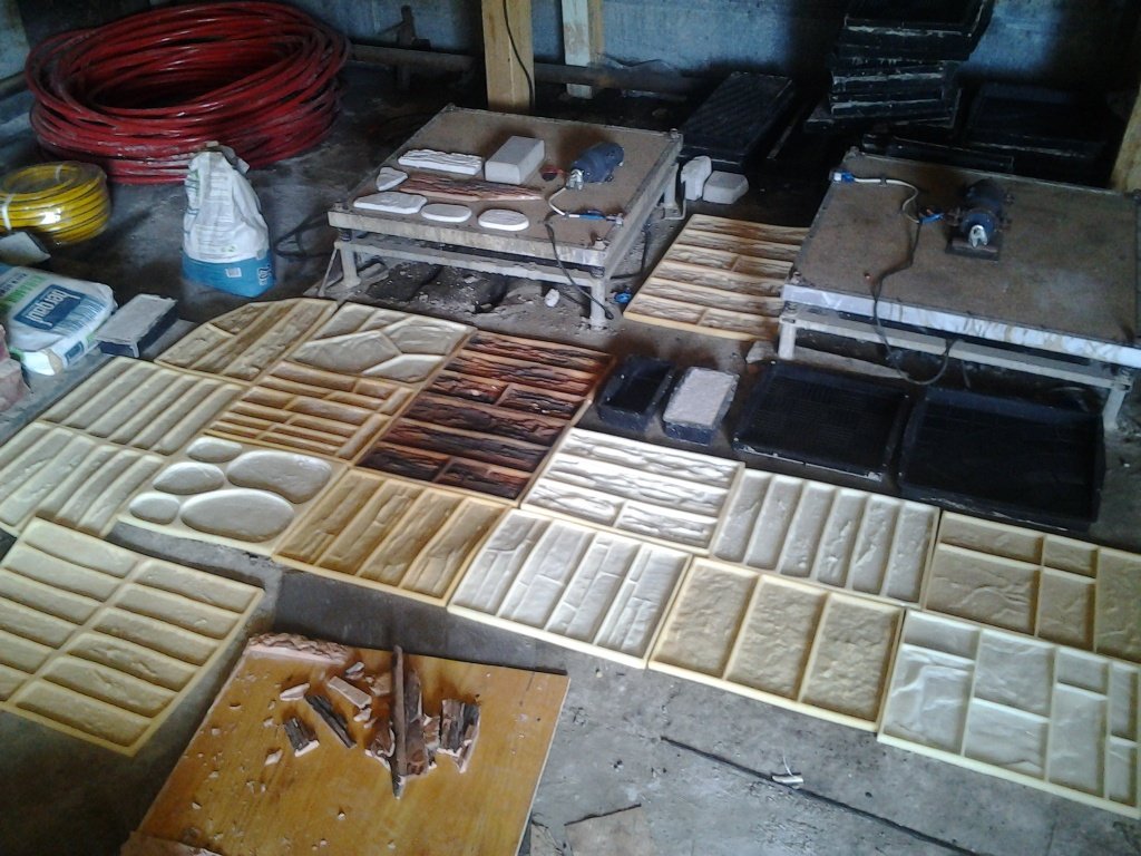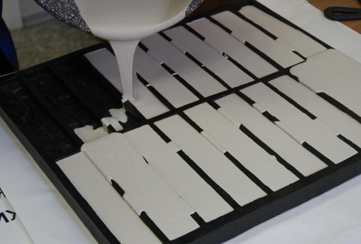 El trabajo llevará varios días. Para formar una capacidad futura, se requiere una muestra de mosaico. En la matriz terminada, vierta el poliuretano líquido con un endurecedor y espere hasta que se solidifique por completo. Para la producción de ladrillos, una profundidad de 0.5-1 cm es suficiente, y para simular pizarra - 1-2.5 cm.