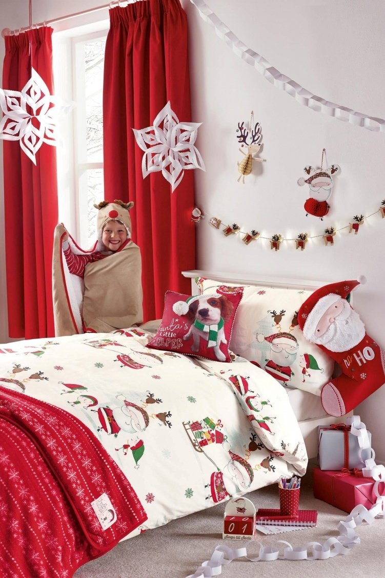 Las paredes son un lugar adecuado para la aplicación de Año Nuevo. Calcomanías temporales, bolas, guirnaldas, hermosos paneles harán. Los juguetes de papel hechos en casa se pueden colgar del techo. Los niños pequeños estarán encantados con la nueva ropa de cama con temas navideños. Para los niños mayores, puede elegir sábanas con estrellas, copos de nieve.