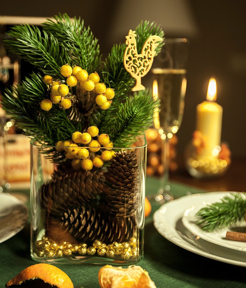 Exposición de un estilo.La decoración en estilo ecológico solo acepta materiales naturales. Para los clásicos, las flores, las ramas de abeto son adecuadas. La mesa escandinava de Año Nuevo es simple y elegante. Una idea interesante de servir al estilo de una mesa de buffet también está ganando popularidad.