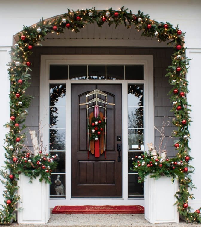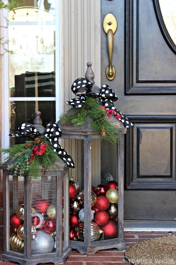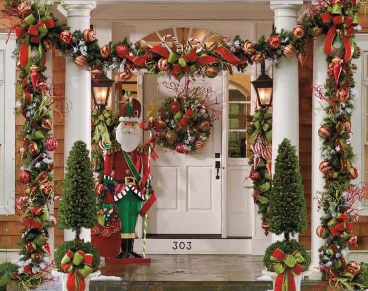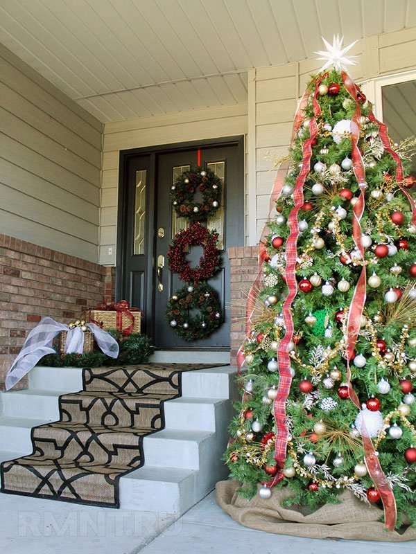 A ambos lados de la puerta de entrada puede instalar guardias: muñecos de nieve o renos divertidos.Estera temática será genial. Las cintas de raso grandes se verán originales en las columnas o en cualquier elemento alargado. Agujas cubiertas de nieve, ramas de fresno de montaña se pueden utilizar para decorar barandas y otros elementos de la extensión externa.