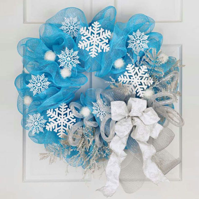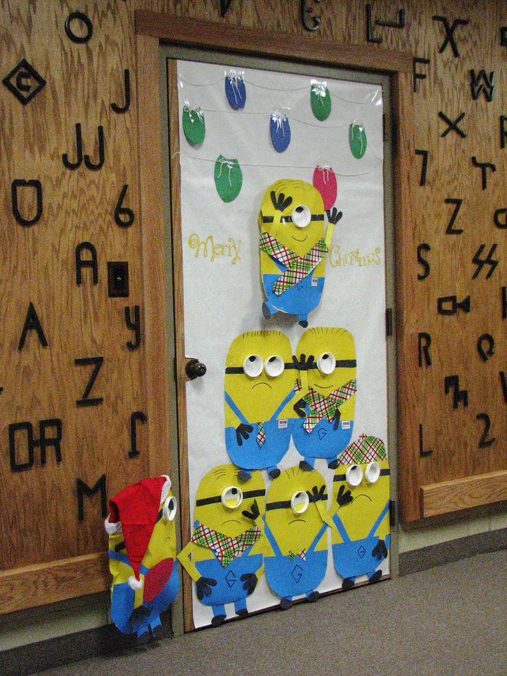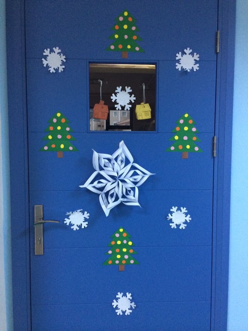 También puedes usar cintas de raso de cualquier color. En la intersección, cuelga un hermoso arco o cualquier otra composición. El fondo blanco de la puerta es ideal para aplicaciones en forma de muñeco de nieve.De acuerdo con la plantilla que usa una plantilla, se hacen varios elementos de la imagen y se colocan en la superficie. Brillantes guirnaldas de papel, dibujos divertidos e inscripciones se verán bien. Afuera, la puerta se puede decorar con elementos temáticos al aire libre: jarrones con figuras con ramas de abeto, figuras de ciervos, animales, cualquier personaje de cuento de hadas.
