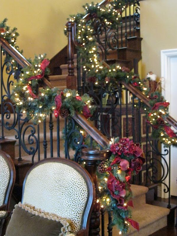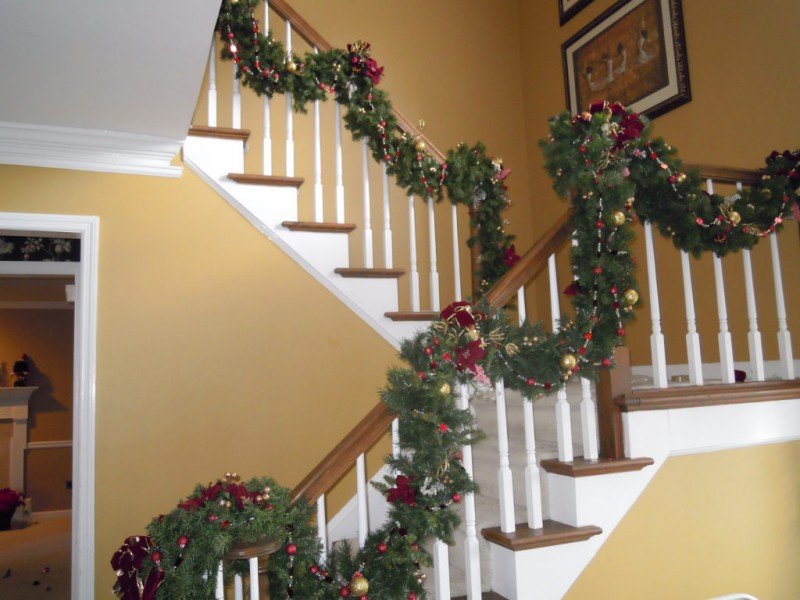 Al elegir joyas para las escaleras, uno debe tener en cuenta su método de montaje.Los botones, el cable apretado pueden dejar rasguños y rasguños. La decoración no debe crear un peligro al moverse. Las guirnaldas y los colgantes deben encajar armoniosamente en el estilo general y la combinación de colores del interior del Año Nuevo.