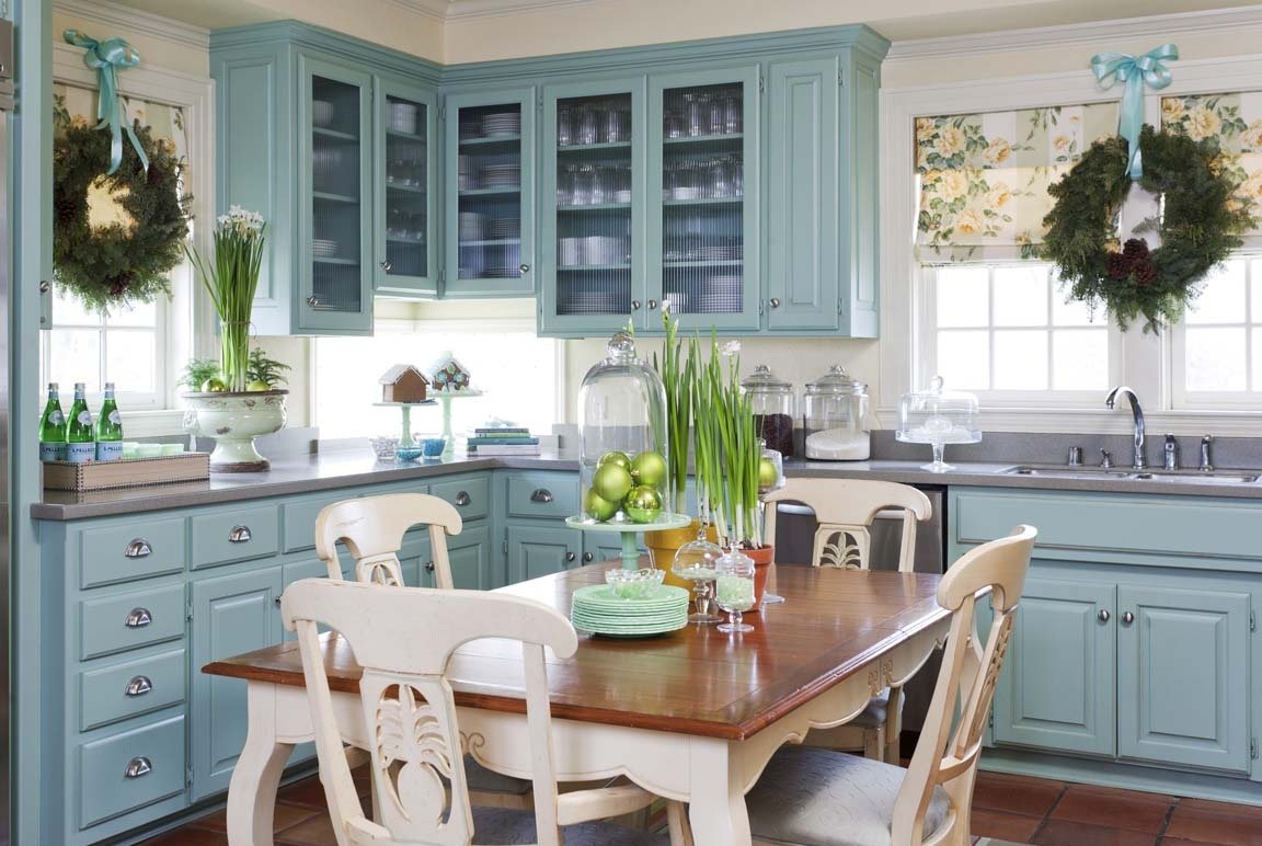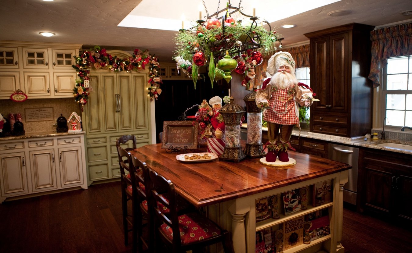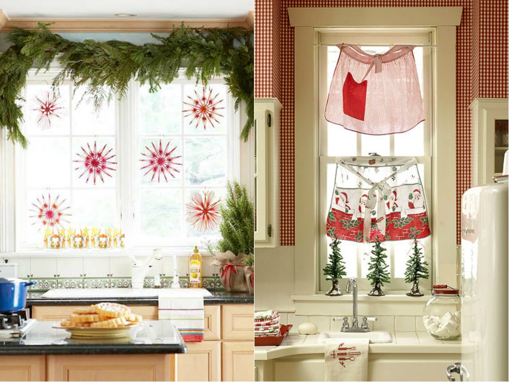 Una buena manera de mostrar su personalidad es colocar varios carteles de diseño con saludos de Año Nuevo en la cocina. Figuras temáticas, platos con Santa Claus, copos de nieve complementarán el interior con un verdadero cuento de hadas. Estrellas brillantes de metal, conos naturales en forma de guirnalda darán un mar de sonrisas. A los defensores minimalistas les gustarán ramitas misteriosas con una decoración rara en la cocina provenzal.