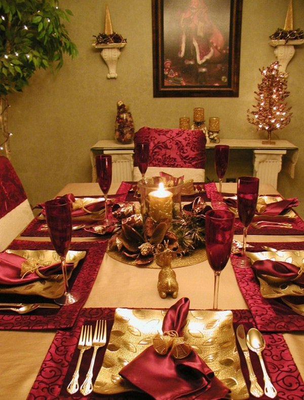 La designación del centro de la mesa. En el lugar más visible, puede colocar un hermoso stand con servilletas de Año Nuevo, una botella de champán o una vela brillante;