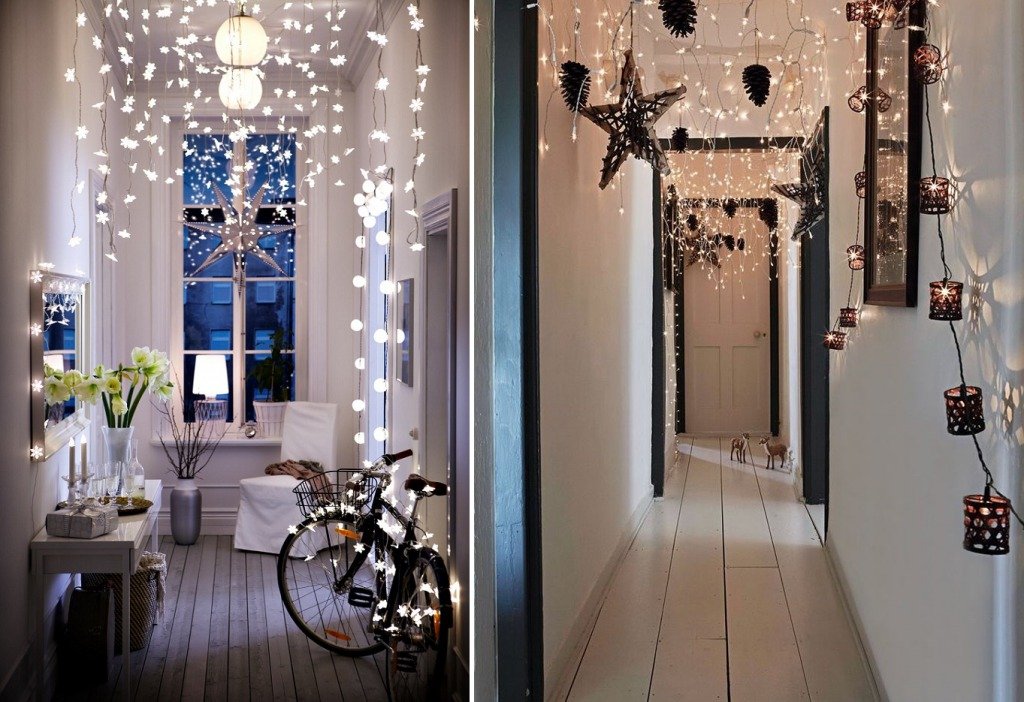 Una opción de ganar-ganar para el pasillo es una corona decorativa en la puerta.Puedes vestir un espejo con oropel blanco como la nieve, copos de nieve de papel. Grandes velas en los stands, pegatinas de saludo en las paredes te ayudarán a sentir el acercamiento de las vacaciones.