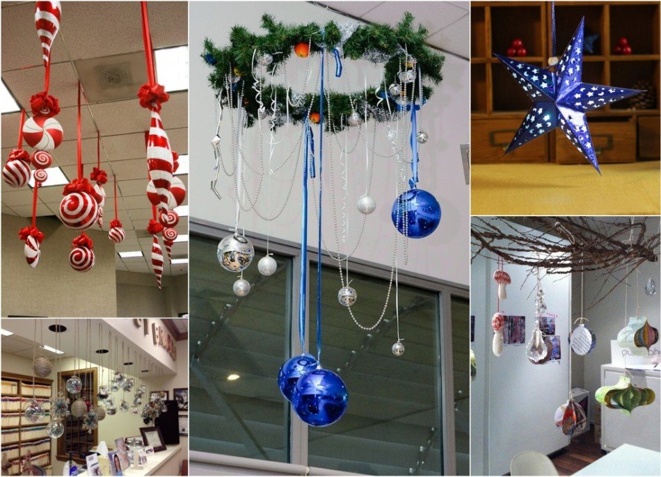 La forma más fácil y menos costosa de decorar el techo para el Año Nuevo es colgar bolas y lluvia. La parafernalia navideña suspendida fascina fascinantemente a la luz de las guirnaldas y complementa perfectamente la imagen general. También puede usar figuras multicolores hechas de cartón, papel metalizado. Se ve muy bien en la artesanía de cuentas, cuentas brillantes y otros accesorios brillantes.